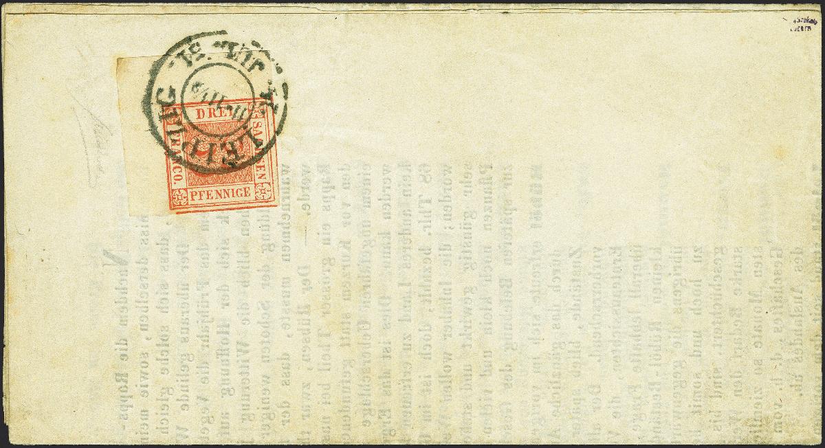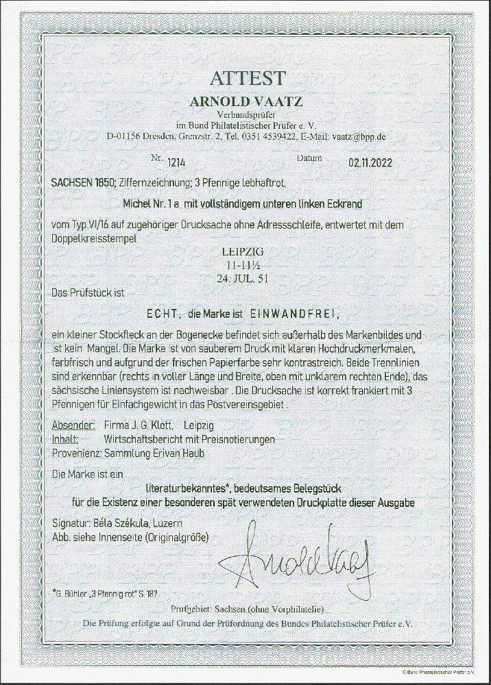 | Zusatzinformationen und Suchstichworte: | 380. Auktion Heinrich Köhler Auktionstermin 25.03.2023 Los 233 3 Pfennige lebhaftrot, Platte VI, Typ 16, allseits breitrandige linke untere Bogenecke in schöner frischer und leuchtender Farbe, zweiseitig mit Trennungslinien, links und unten mit ca. 7/8 mm Bogenrändern, mit sauber aufgesetztem Doppelkreisstempel "LEIPZIG 24. JUL. 51." auf vollständiger Drucksache (Bericht über Ernte und Preise für diverse Öle, etc.) ohne Adressschleife. In der äußeren Bogenecke ganz gering getönt, sonst tadellose, ursprüngliche Erhaltung. Ein phänomenales und altbekanntes Stück. Signiert Friedl und Bela Szekula, Fotoattest Vaatz BPP (2022) Ausruf 20.000,00 EUR Zuschlag 52.000,00 EUR (aus der Sammlung Erivan Haub) |