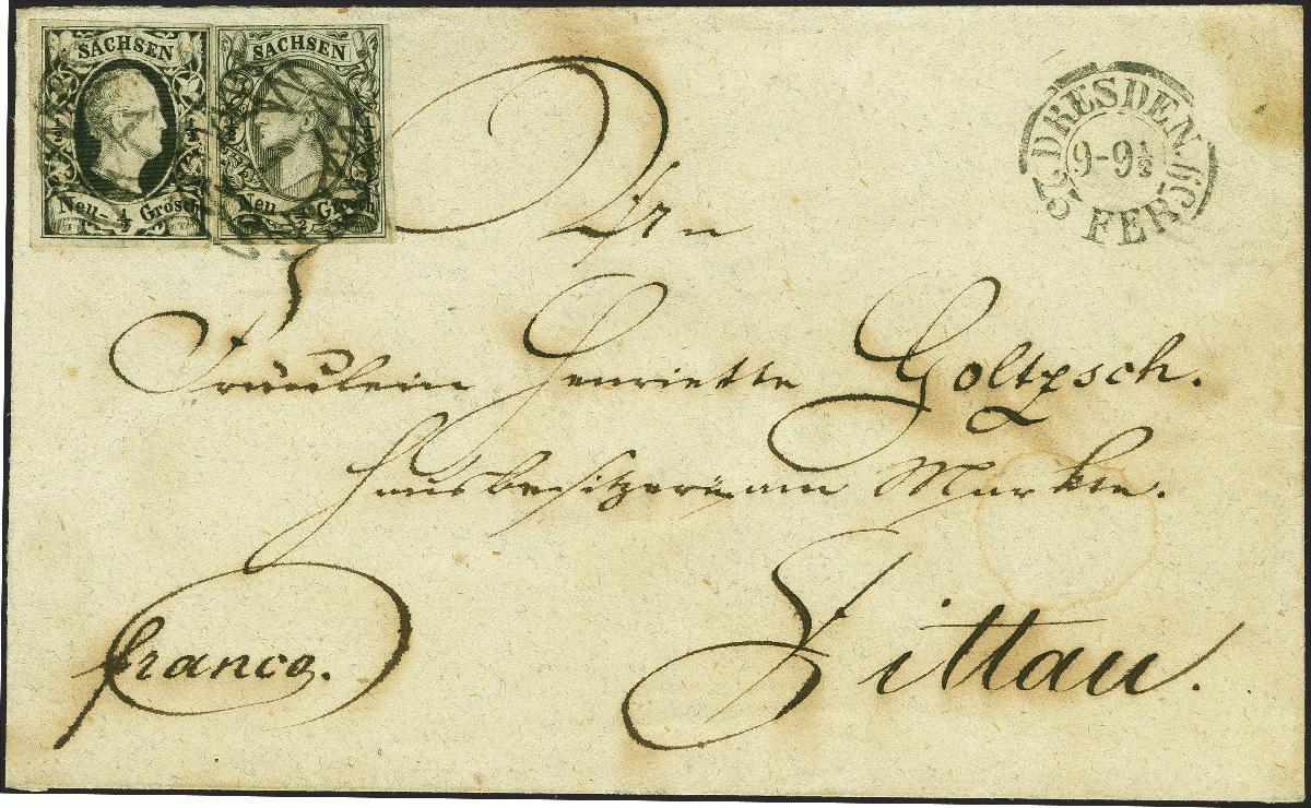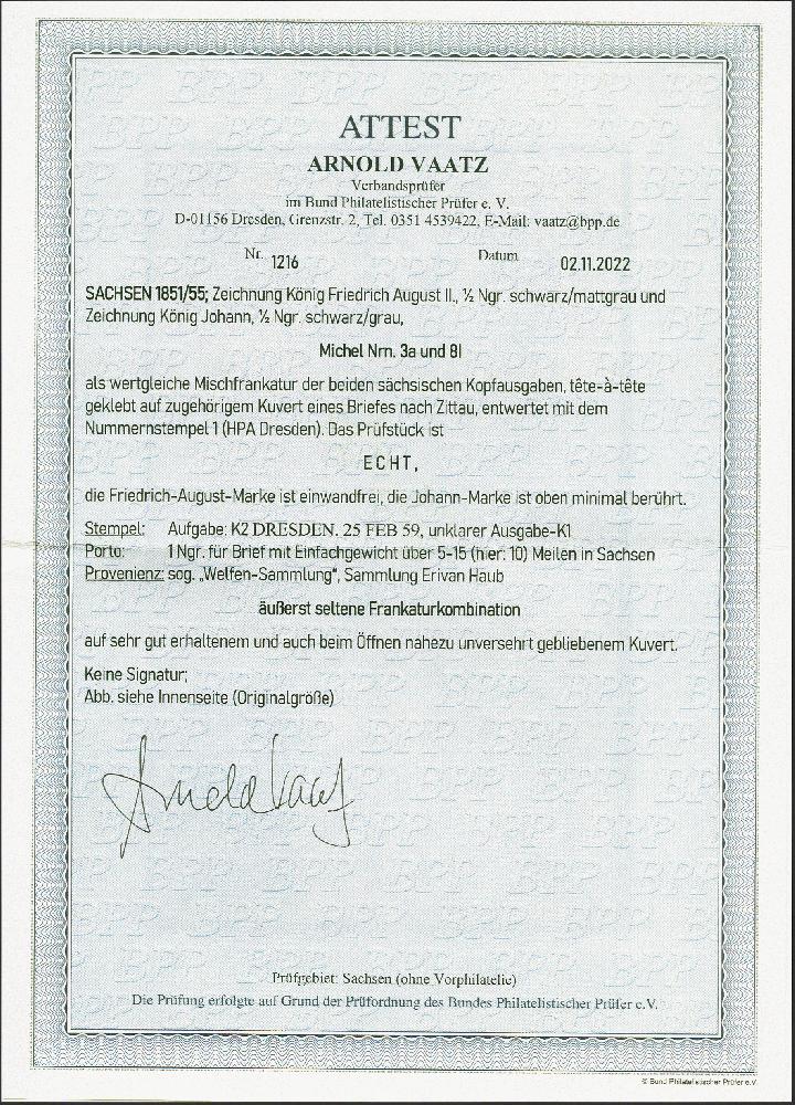 | Zusatzinformationen und Suchstichworte: | 380. Auktion Heinrich Köhler Auktionstermin 25.03.2023 Los 234 1851, Friedrich August ½ Neugroschen schwarz auf mattgrau, voll- bis breitrandig, in wertstufengleicher Mischfrankatur mit oben leicht berührter Johann ½ Neugroschen schwarz auf mattgrau, tête-à-tête geklebt, mit jeweils sauber aufgesetztem Nummernstempel "1" und nebengesetztem Einkreisstempel "DRESDEN 25 FEB 59" auf Briefkuvert nach Zittau. Eine äußerst seltene und attraktive Mischfrankatur in sonst einwandfreier Erhaltung. Fotoattest Vaatz BPP (2022) Ausruf 1.000,00 EUR Zuschlag 1.450,00 EUR (aus der Sammlung Erivan Haub) |