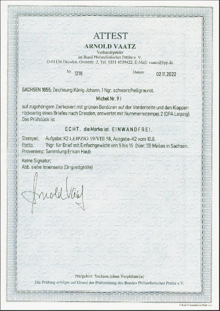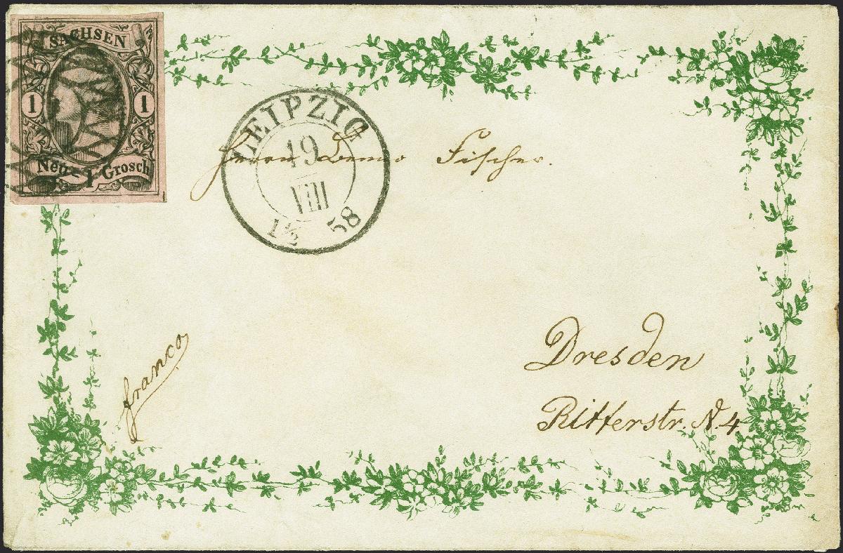 | Zusatzinformationen und Suchstichworte: | 380. Auktion Heinrich Köhler Auktionstermin 25.03.2023 Los 237 1 Neugroschen schwarz auf graurot, voll- bis breitrandig, mit sauber aufgesetzter Nr. "2" und klar nebengesetztem Doppelkreisstempel "LEIPZIG 19/VIII 58" auf kleinem Damenkuvert mit gedruckten grünen Blumenranken, nach Dresden mit Ausgabestempel. Ein sehr attraktives Stück in einwandfreier Erhaltung. Fotoattest Vaatz BPP (2022) Ausruf 300,00 EUR Zuschlag 1.300,00 EUR (aus der Sammlung Erivan Haub) |