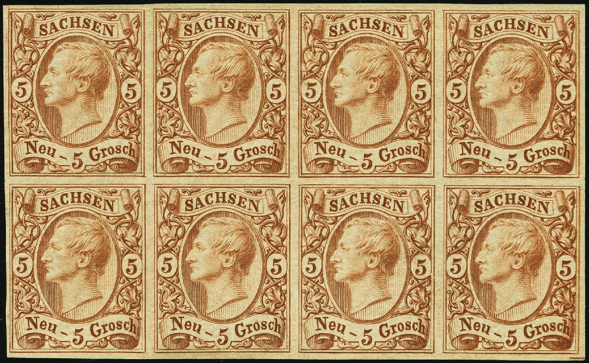 | Zusatzinformationen und Suchstichworte: | 380. Auktion Heinrich Köhler Auktionstermin 25.03.2023 Los 238 5 Neugroschen rostbraun, der früher sogenannte 'Farbfehldruck', waagerechter 8er-Block in frischer Farbe, allseits breit gerandet, ungebraucht mit frischem Originalgummi, meist postfrisch. Sehr schöne und tadellose Erhaltung. Ungebrauchte Einheiten der Frühauflagen sind große Seltenheiten, dieser Block ist die größte registrierte Einheit dieser Marke und ein Unikat. Signiert Colson, Georg Bühler und Bloch, Fotoattest Vaatz BPP (2022) Ausruf 12.000,00 EUR (aus der Sammlung Erivan Haub) |