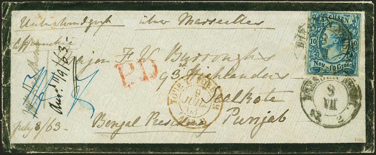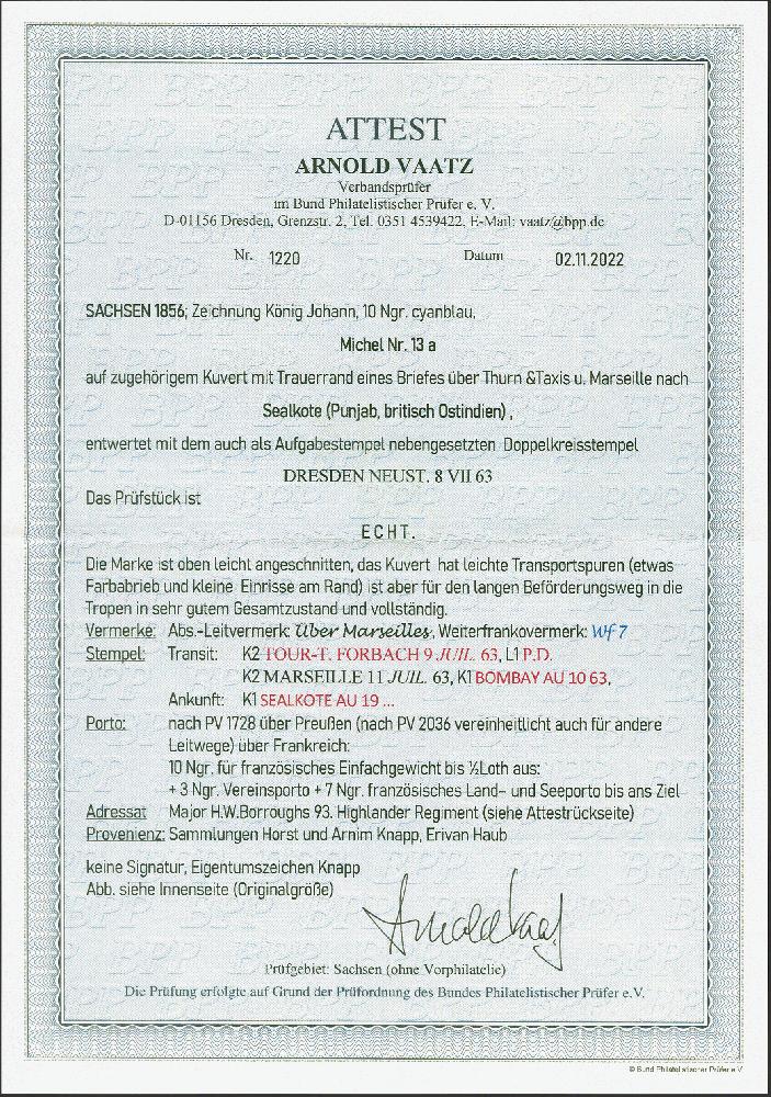 | Zusatzinformationen und Suchstichworte: | 380. Auktion Heinrich Köhler Auktionstermin 25.03.2023 Los 239 Johann 10 Neugroschen blau, oben etwas angeschnitten, sonst voll- bis breitrandig, mit #Stempel "DRESDEN NEUST. 8 VII 63" auf kleinem Trauerkuvert via Marseille und Bombay an einen Major beim 93. Highlander-Regiment in Sealkote/Punjab, Indien. Das Kuvert mit zu erwartenden leichten Transportspuren, sonst einwandfreie Erhaltung. Nach dem Postvertrag von 1858 betrug das Porto für Briefe über Frankreich und Suez 10 Neugroschen, davon verblieben 3 Neugroschen im Postverein. Eine seltene, und mit der Destination Indien eine wohl einmalige Einzelfrankatur. Fotoattest Vaatz BPP (2022) Ausruf 3.000,00 EUR Zuschlag 3.800,00 EUR (aus der Sammlung Erivan Haub) |