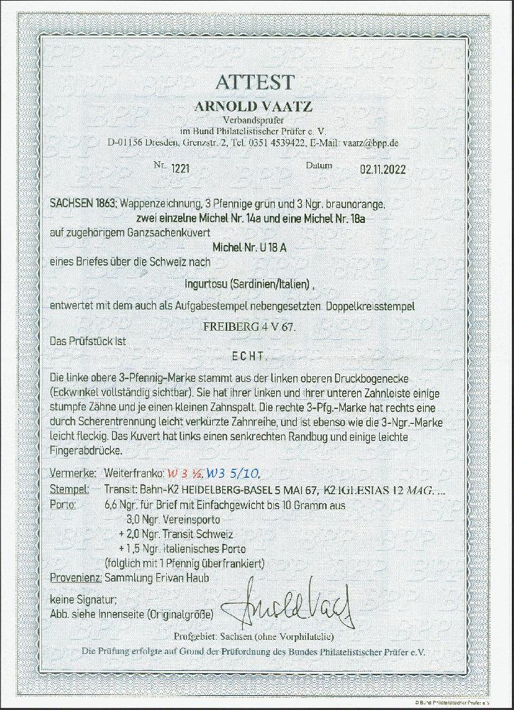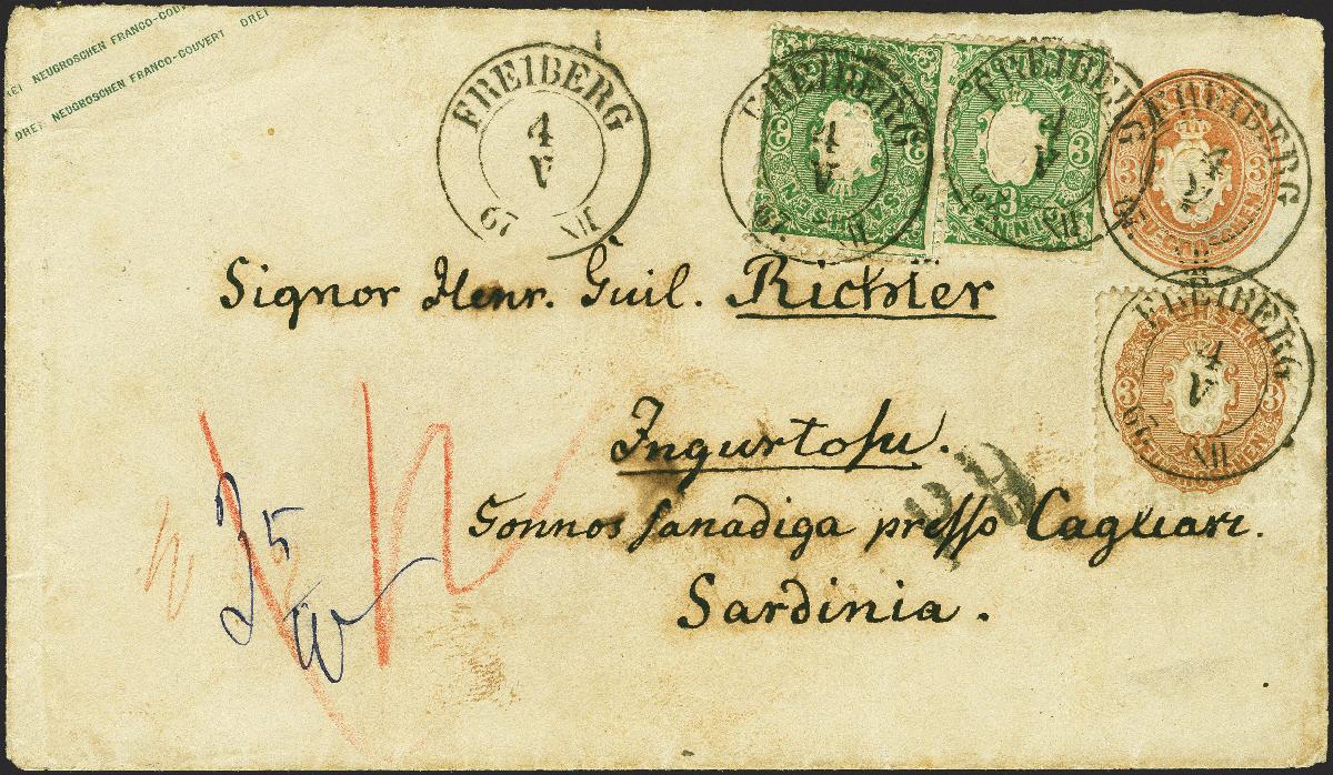 | Zusatzinformationen und Suchstichworte: | 380. Auktion Heinrich Köhler Auktionstermin 25.03.2023 Los 241 3 Pfennige grün, 2 Einzelwerte (einmal aus der linken oberen Bogenecke mit vollständigem Eckwinkel) zusammen mit 3 Neugroschen braunorange, als Zufrankatur auf Ganzsachenumschlag 3 Neugroschen braun mit Doppelkreisstempel "FREIBERG 4 V 67" über die badische Bahnpost und die Schweiz nach Ingurtosu auf Sardinien. Die 3 Pfg.-Werte Scherentrennung, jedoch meist außerhalb, nur ein Wert einseitig stumpfe Zähnung, der andere Wert wenige stumpfe Zähne mit zwei kleinen Zahnspalten. Eine dekorative und sehr seltene Frankatur-Kombination mit obligatorischer Überfrankatur von 1 Pfennig. Fotoattest Vaatz BPP (2022) Ausruf 1.000,00 EUR Zuschlag 1.050,00 EUR (aus der Sammlung Erivan Haub) |