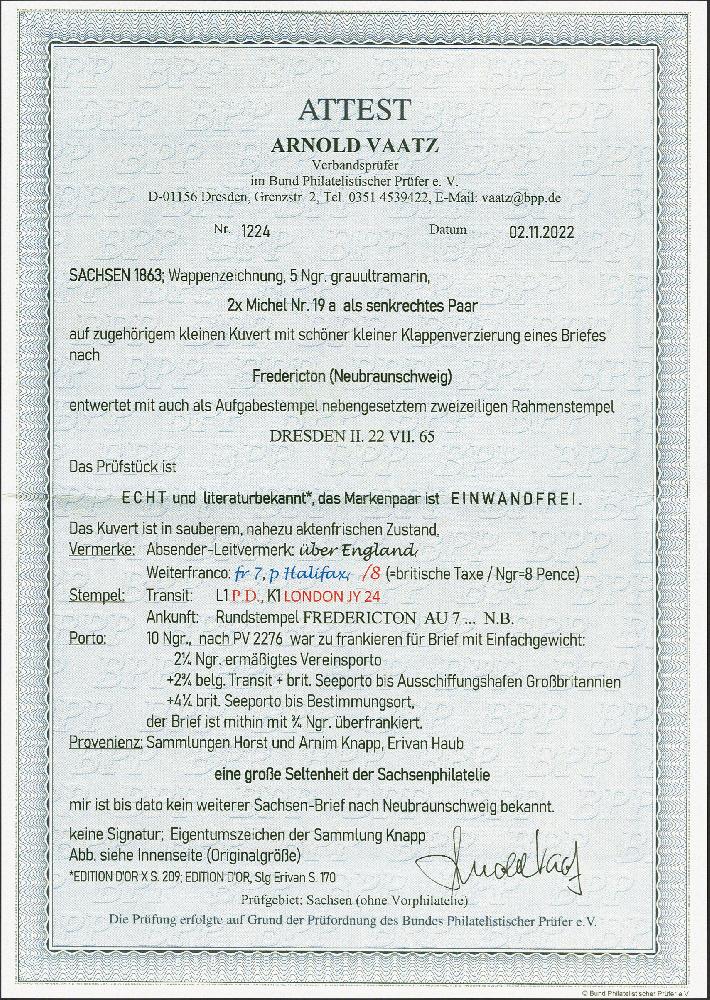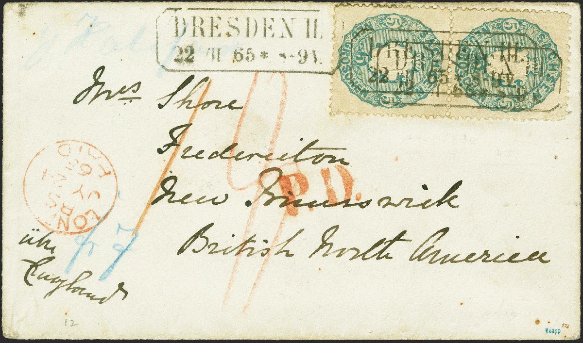 | Zusatzinformationen und Suchstichworte: | 380. Auktion Heinrich Köhler Auktionstermin 25.03.2023 Los 243 Wappen 5 Neugroschen grauultamarin im senkrechten Paar, farbfrisch und gut gezähnt, mit sauber auf- und nebengesetztem Rahmenstempel "DRESDEN 22 VII 65" auf kleinem Briefkuvert über London nach Fredericton in der kanadischen Provinz Neu Braunschweig mit rückseitigem Eingangsstempel vom 17. 8.. Das Porto betrug seit dem 1. Januar 1863 2 ¼ Neugroschen ermäßigtes Vereinsporto und 7 Neugroschen Weiterfranko, letzteres korrekt notiert, jedoch der Brief insgesamt mit ¾ Neugroschen überfrankiert (möglicherweise aufgrund des fehlenden Platzes). Frische und einwandfreie Erhaltung. Briefe der altdeutschen Staaten nach Britisch Nordamerika sind ausgesprochen selten; in die kleine Kolonie Neubraunschweig ist aus Sachsen kein weiterer bekannt. Fotoattest Vaatz BPP (2022) Ausruf 3.000,00 EUR Zuschlag 3.000,00 EUR (aus der Sammlung Erivan Haub) |
