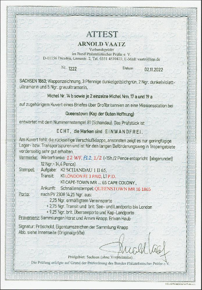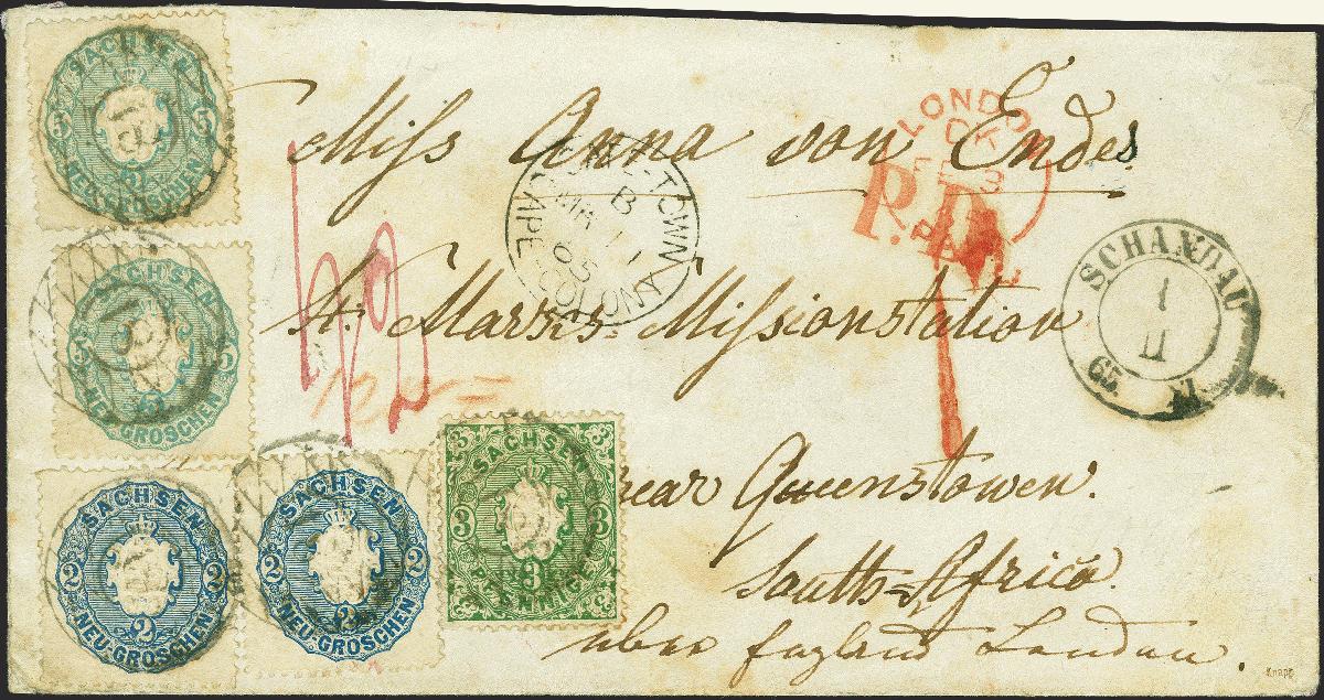 | Zusatzinformationen und Suchstichworte: | 380. Auktion Heinrich Köhler Auktionstermin 25.03.2023 Los 245 Wappen 5 Neugroschen graublau und 2 Neugroschen blau, je 2 Einzelwerte, zusammen mit 3 Pfennig grün, alle einzeln sauber entwertet mit Nummernstempel "81" auf Briefkuvert mit nebengesetztem Doppelkreisstempel "SCHANDAU 1 II 65" über Preußen, Belgien und England an eine Missionsstation bei Queenstown am Kap der Guten Hoffnung mit rückseitigem klarem roten Ankunftsstempel und vorderseitigen Durchgangsstempeln von London und Kapstadt. Das Porto betrug seit dem 1.4.1863 14¼ Groschen, davon "12" Neugroschen als Weiterfranko vermerkt. Die obere Rückklappe fehlt, sonst für einen Brief nach Schwarzafrika in sehr schöner und frischer Erhaltung, sign. Pröschold BPP, Fotoattest Vaatz BPP (2022) Ausruf 3.000,00 EUR Zuschlag 3.000,00 EUR (aus der Sammlung Erivan Haub) |