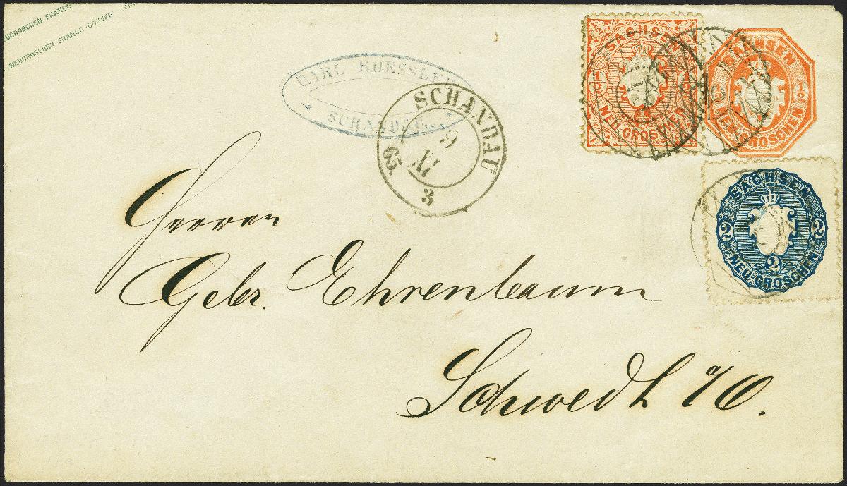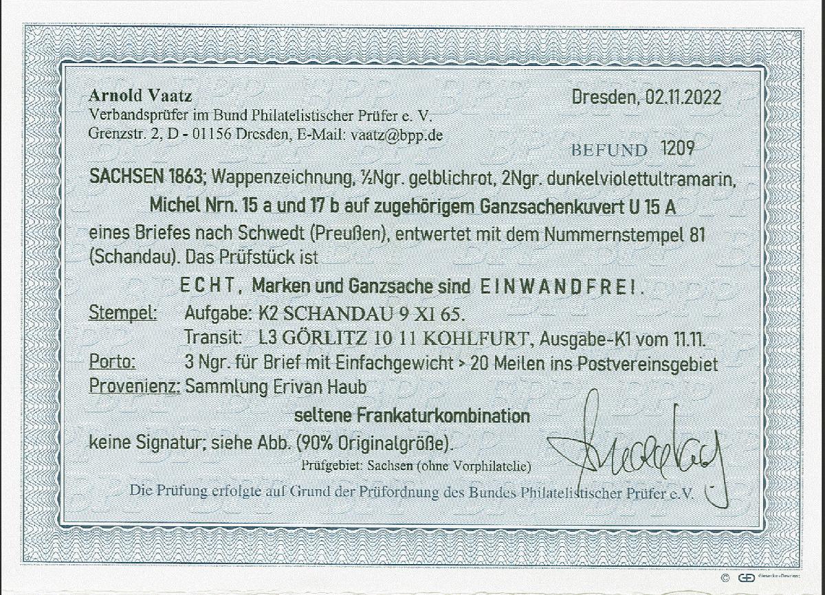 | Zusatzinformationen und Suchstichworte: | 380. Auktion Heinrich Köhler Auktionstermin 25.03.2023 Los 248 Umschlag Wappen ½ Neugroschen orange mit Zufrankatur ½ Neugroschen gelblichrot und 2 Neugroschen dunkelviolettultramarin, mit Nummernstempel "81" und sauber nebengesetztem Doppelkreisstempel "SCHANDAU 9 XI 65" nach Schwedt in Preußen. Kleiner Teil einer Seitenklappe fehlend, sonst einwandfrei. Eine attraktive und seltene Frankaturkombination. Fotobefund Vaatz BPP (2022) Ausruf 200,00 EUR Zuschlag 440,00 EUR (aus der Sammlung Erivan Haub) |