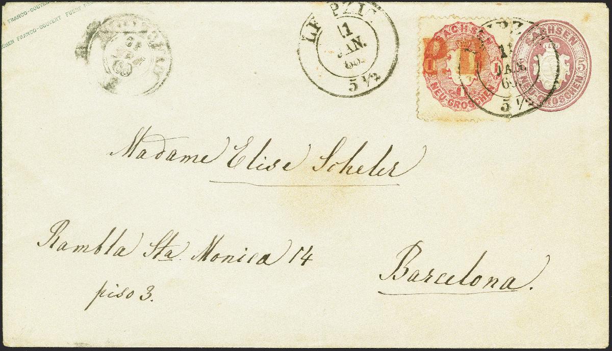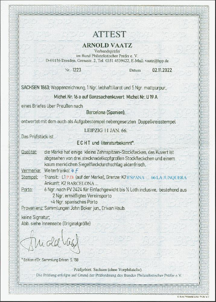 | Zusatzinformationen und Suchstichworte: | 380. Auktion Heinrich Köhler Auktionstermin 25.03.2023 Los 249 Umschlag Wappen 5 Neugroschen mattpurpur mit Zufrankatur 1 Neugroschen lebhaftlilarot, mit Doppelkreisstempel "LEIPZIG 11 JAN. 66." nach Barcelona, Spanien, mit Transit- und Ankunftsstempeln. Minimale Fleckchen, sonst einwandfreie Erhaltung. Ein schöner Auslandsbrief. Fotoattest Vaatz BPP (2022) Ausruf 200,00 EUR Zuschlag 900,00 EUR (aus der Sammlung Erivan Haub) |