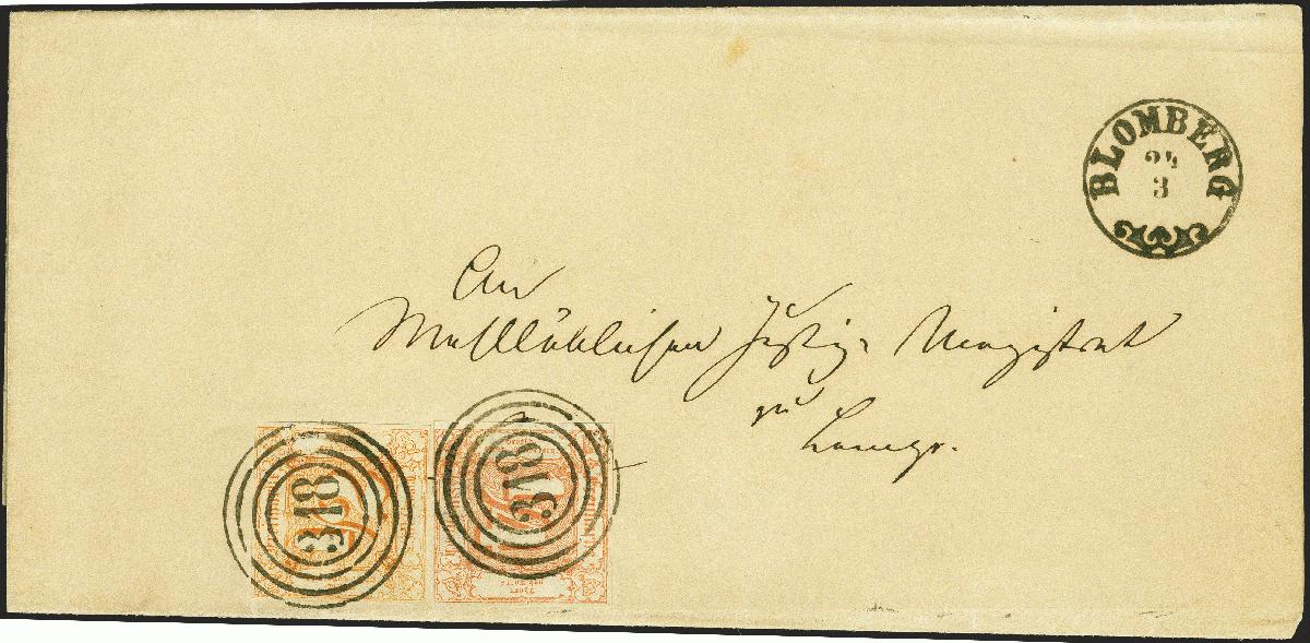 | Zusatzinformationen und Suchstichworte: | 380. Auktion Heinrich Köhler Auktionstermin 25.03.2023 Los 263 ½ Silbergroschen orange in Mischfrankatur mit 1859/61, ¼ Silbergroschen rötlichorange, beide farbfrisch und voll- bis breitrandig mit jeweils klar aufgesetzter Nr. "318" und sauber nebengesetztem kleinen Zier-Einkreisstempel "BLOOMBERG 24 3" auf Briefhülle nach Lemgo mit vorausbezahltem Bestellgeld. Ein besonders attraktiver Brief in einwandfreier Erhaltung. Fotobefund Sem BPP (2022) Ausruf 200,00 EUR Zuschlag 320,00 EUR (aus der Sammlung Erivan Haub) |