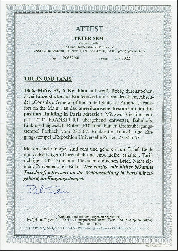 | Zusatzinformationen und Suchstichworte: | 380. Auktion Heinrich Köhler Auktionstermin 25.03.2023 Los 267 1866, 6 Kreuzer blau, 2 Einzelwerte, beide farbfrisch und gut durchstochen, mit Nr. "220" und leicht nebengesetztem Einkreisstempel "FRANKFURT A.M. BAHNHOF 22/5 1867" auf Briefkuvert mit vorderseitigem Absender-Eindruck des amerikanischen Generalkonsulates in Frankfurt, adressiert an das amerikanische Restaurant im Ausstellungsgebäude der Weltausstellung in Paris mit Ankunftsstempel "EXPOSITION UNIVERSELLE". Ein ganz ungewöhnliches und interessantes Stück. Fotoattest Sem BPP (2022) Ausruf 500,00 EUR Zuschlag 520,00 EUR (aus der Sammlung Erivan Haub) |