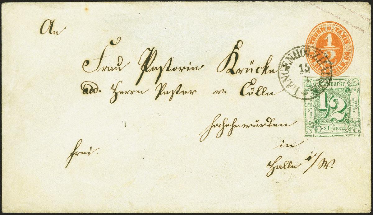 | Zusatzinformationen und Suchstichworte: | 380. Auktion Heinrich Köhler Auktionstermin 25.03.2023 Los 269 1861, Umschlag ½ Silbergroschen orange mit Zufrankatur 1859/61, ½ Silbergroschen grün, farbfrisch und breit- bis überrandig, mit Teilen von 3 Nachbarmarken, mit sauber aufgesetztem kleinen Einkreisstempel "LANGENHOLZHAUSEN 15/7" nach Halle. In der Ganzsache leichte senkrechte Faltung außerhalb der Frankatur, die rückseitige Verschlussklappe fehlend, sonst einwandfrei. Eine schöne wertstufengleiche Farbfrankatur. Fotoattest Sem BPP (2022) Ausruf 200,00 EUR Zuschlag 650,00 EUR (aus der Sammlung Erivan Haub) |