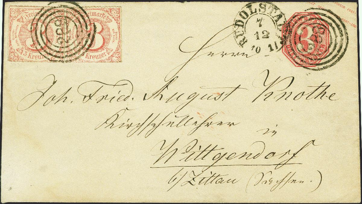 | Zusatzinformationen und Suchstichworte: | 380. Auktion Heinrich Köhler Auktionstermin 25.03.2023 Los 271 1865, Umschlag 3 Kreuzer rosa mit wertstufengleicher Zufrankatur 1865, 3 Kreuzer rosa, 2 Einzelwerte, mit Nr. "288" und nebengesetztem Einkreisstempel "RUDOLSTADT 7 12" (1866) nach Wittgendorf bei Zittau. Einwandfrei. Fotobefund Sem BPP (2022) Ausruf 100,00 EUR Zuschlag 360,00 EUR (aus der Sammlung Erivan Haub) |