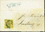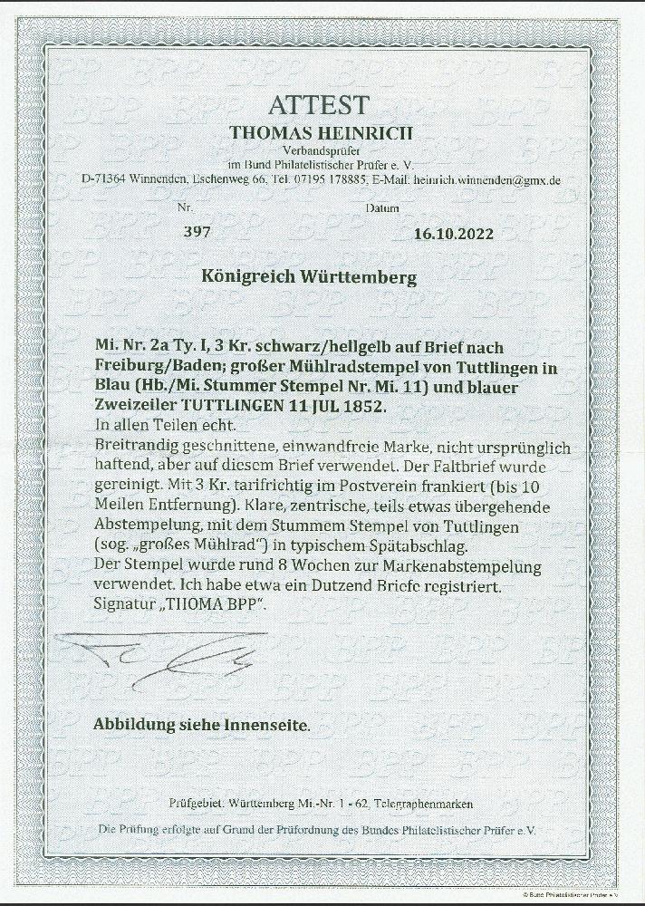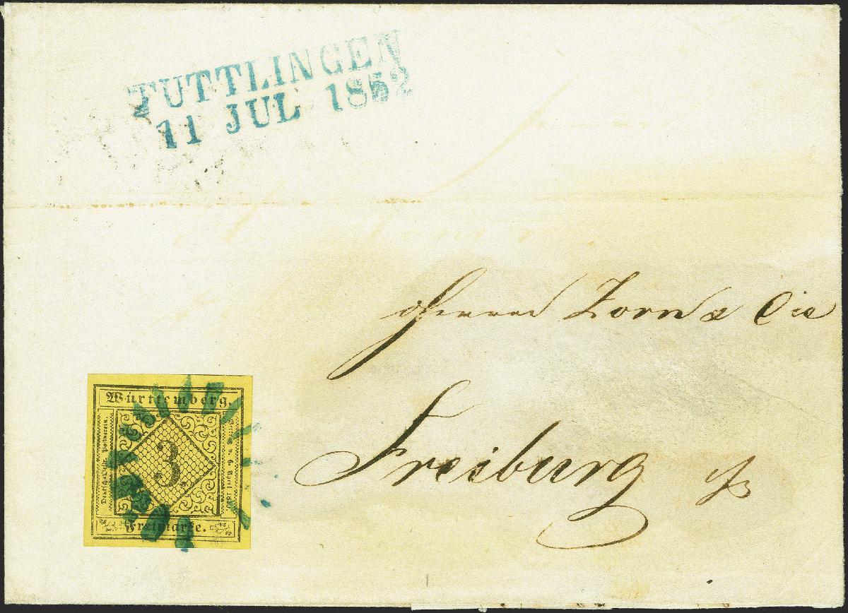 | Zusatzinformationen und Suchstichworte: | 380. Auktion Heinrich Köhler Auktionstermin 25.03.2023 Los 280 3 Kreuzer schwarz auf hellgelb, Type I, farbfrisch und breitrandig, mit sauber aufgesetztem 'Großen Mühlradstempel' auf Briefhülle mit sauber nebengesetztem blauen Langstempel "TUTTLINGEN 11 JUL 1852" nach Freiburg in Baden. Die Hülle – insbesondere im Adressbereich – gereinigt, sonst einwandfrei. Es sind etwa ein Dutzend Briefe mit dem seltenen stummen Stempel registriert, der im Sommer 1852 für rund 8 Wochen zur Markenentwertung verwendet wurde. Signiert Decker und Thoma BPP mit Fotoattest (1984), Fotoattest Heinrich BPP (2022) Ausruf 1.000,00 EUR Zuschlag 3.200,00 EUR (aus der Sammlung Erivan Haub) |