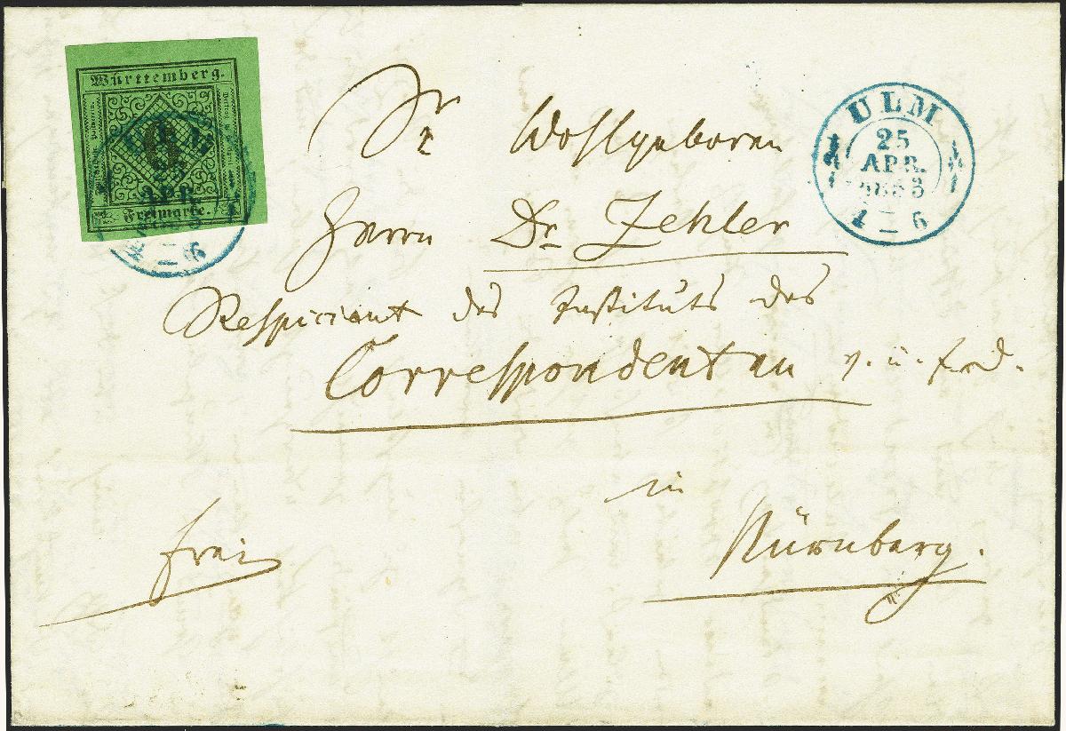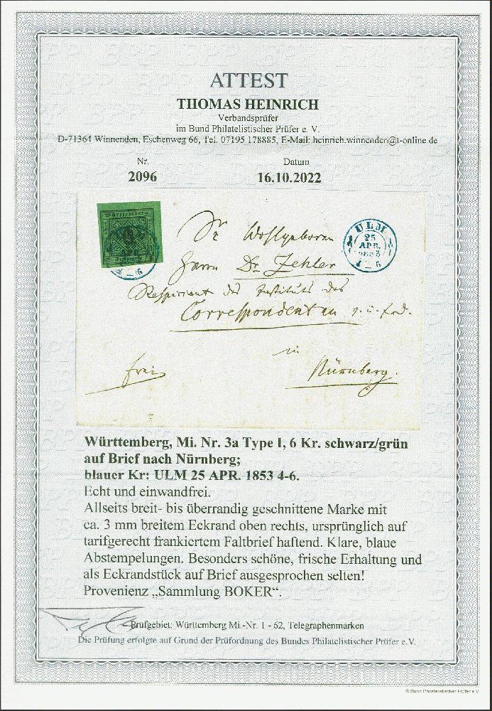 | Zusatzinformationen und Suchstichworte: | 380. Auktion Heinrich Köhler Auktionstermin 25.03.2023 Los 282 6 Kreuzer schwarz auf grün, rechte obere Bogenecke, farbfrisch und voll- bis meist breitrandig, oben und rechts mit ca. 3 mm Bogenrand, mit sauber auf- und nebengesetztem blauem Doppelkreisstempel "ULM 25 APR. 1853" auf Faltbrief nach Nürnberg. Ein besonders attraktiver Brief in tadelloser Erhaltung. Fotoattest Heinrich BPP (2022) Ausruf 300,00 EUR Zuschlag 650,00 EUR (aus der Sammlung Erivan Haub) |