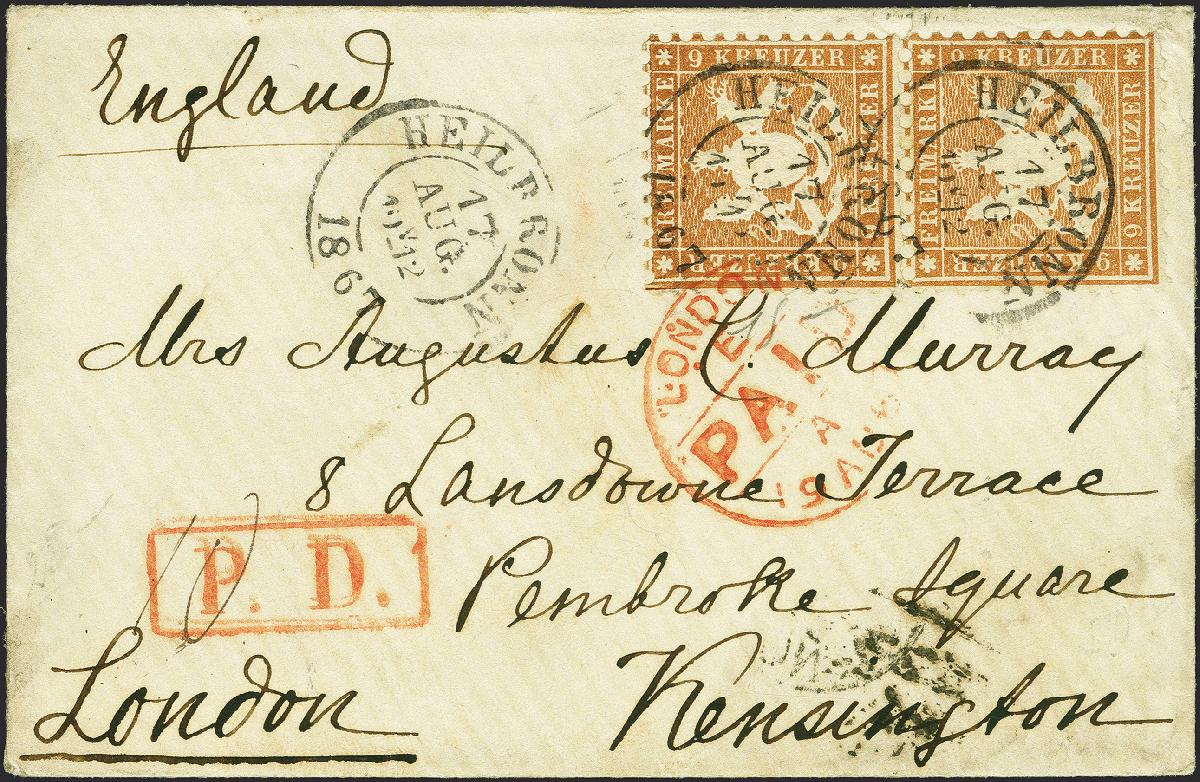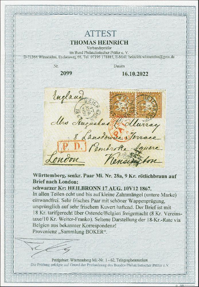 | Zusatzinformationen und Suchstichworte: | 380. Auktion Heinrich Köhler Auktionstermin 25.03.2023 Los 285 1863/64, 9 Kreuzer rötlichbraun im senkrechten Paar, die untere Marke kleine Zahnmängel, sonst einwandfrei und farbfrisch, mit sauber auf- und nebengesetztem Doppelkreisstempel "HEILBRONN 17 AUG. 1867" auf kleinem Briefkuvert nach Kensington. Ein attraktiver Brief in frischer und sonst einwandfreie Erhaltung. Fotoattest Heinrich BPP (2022) Ausruf 200,00 EUR Zuschlag 900,00 EUR (aus der Sammlung Erivan Haub) |