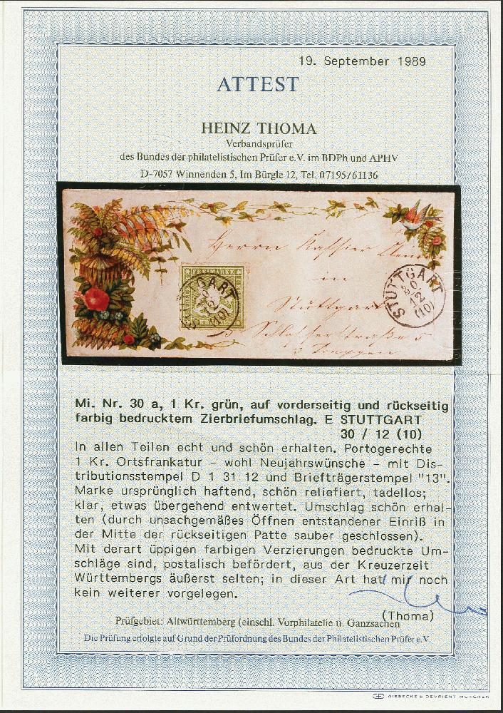 | Zusatzinformationen und Suchstichworte: | 380. Auktion Heinrich Köhler Auktionstermin 25.03.2023 Los 287 1865, 1 Kreuzer gelbgrün, farbfrisch, im oberen Bereich teils etwas unregelmäßig durchstochen, sonst einwandfrei, mit sauber auf- und nebengesetztem Einkreisstempel "STUTTGART 30/12" auf vorder-und rückseitig mehrfarbig bedrucktem Zierbrief mit üppigen Blumenmotiven und kleinem Vogel in der rechten oberen Ecke, als Ortsbrief gelaufen mit rückseitigem Distributionsstempel. Ein ganz ausgefallener und prachtvoller Zierbrief. Fotoatteste Thoma BPP (1989) und Heinrich BPP (2022) Ausruf 2.000,00 EUR Zuschlag 14.500,00 EUR (aus der Sammlung Erivan Haub) |