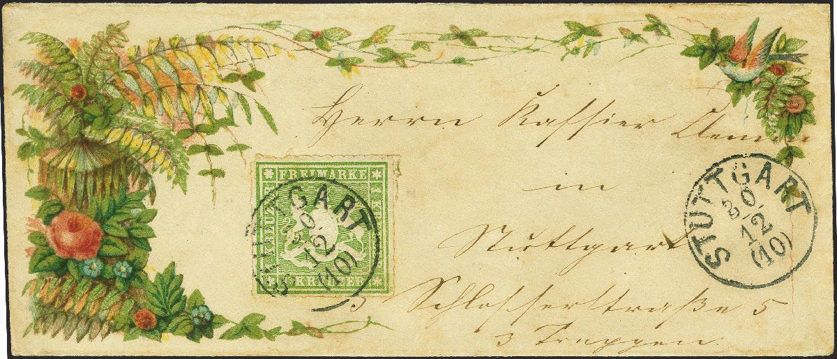 | Zusatzinformationen und Suchstichworte: | 380. Auktion Heinrich Köhler Auktionstermin 25.03.2023 Los 287 1865, 1 Kreuzer gelbgrün, farbfrisch, im oberen Bereich teils etwas unregelmäßig durchstochen, sonst einwandfrei, mit sauber auf- und nebengesetztem Einkreisstempel "STUTTGART 30/12" auf vorder-und rückseitig mehrfarbig bedrucktem Zierbrief mit üppigen Blumenmotiven und kleinem Vogel in der rechten oberen Ecke, als Ortsbrief gelaufen mit rückseitigem Distributionsstempel. Ein ganz ausgefallener und prachtvoller Zierbrief. Fotoatteste Thoma BPP (1989) und Heinrich BPP (2022) Ausruf 2.000,00 EUR Zuschlag 14.500,00 EUR (aus der Sammlung Erivan Haub) |