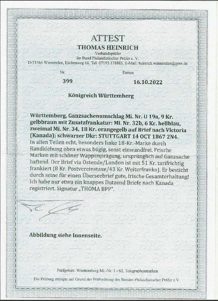 | Zusatzinformationen und Suchstichworte: | 380. Auktion Heinrich Köhler Auktionstermin 25.03.2023 Los 288 6 Kreuzer hellblau und 2 Einzelwerte 18 Kreuzer orangegelb als Zufrankatur auf Ganzsachenumschlag 9 Kreuzer gelbbraun von "STUTTGART 14 OCT. 1867" über England nach Victoria auf Vancouver Island, British Columbia. Die Frankatur ist farbfrisch, eine 18 Kreuzer durch Randklebung oben etwas bügig, sonst einwandfrei. Ein frischer und attraktiver Brief mit der seltenen Destination im Westen des heutigen Kanada. Signiert Thoma BPP mit Fotoattest (1977), Fotoattest Heinrich BPP (2022) Ausruf 2.000,00 EUR Zuschlag 12.000,00 EUR (aus der Sammlung Erivan Haub) |