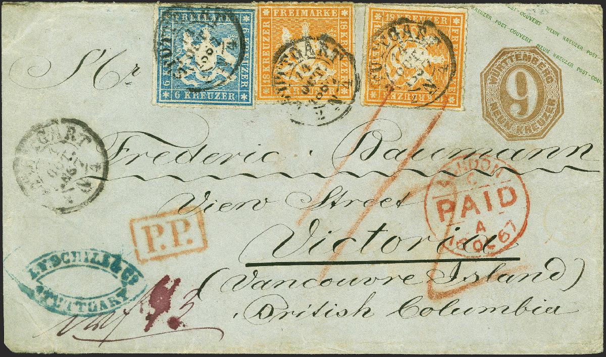 | Zusatzinformationen und Suchstichworte: | 380. Auktion Heinrich Köhler Auktionstermin 25.03.2023 Los 288 6 Kreuzer hellblau und 2 Einzelwerte 18 Kreuzer orangegelb als Zufrankatur auf Ganzsachenumschlag 9 Kreuzer gelbbraun von "STUTTGART 14 OCT. 1867" über England nach Victoria auf Vancouver Island, British Columbia. Die Frankatur ist farbfrisch, eine 18 Kreuzer durch Randklebung oben etwas bügig, sonst einwandfrei. Ein frischer und attraktiver Brief mit der seltenen Destination im Westen des heutigen Kanada. Signiert Thoma BPP mit Fotoattest (1977), Fotoattest Heinrich BPP (2022) Ausruf 2.000,00 EUR Zuschlag 12.000,00 EUR (aus der Sammlung Erivan Haub) |