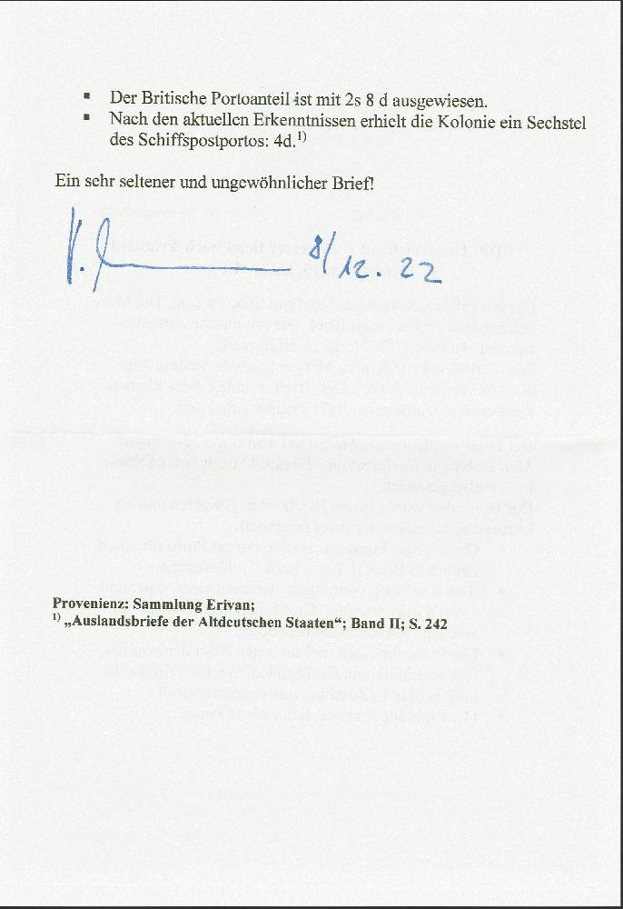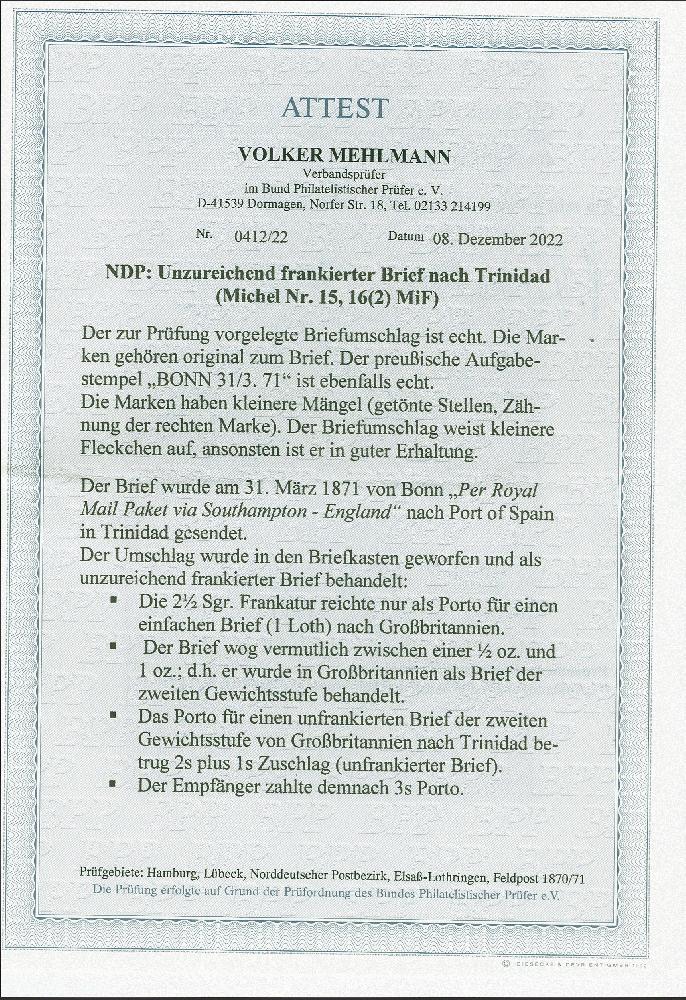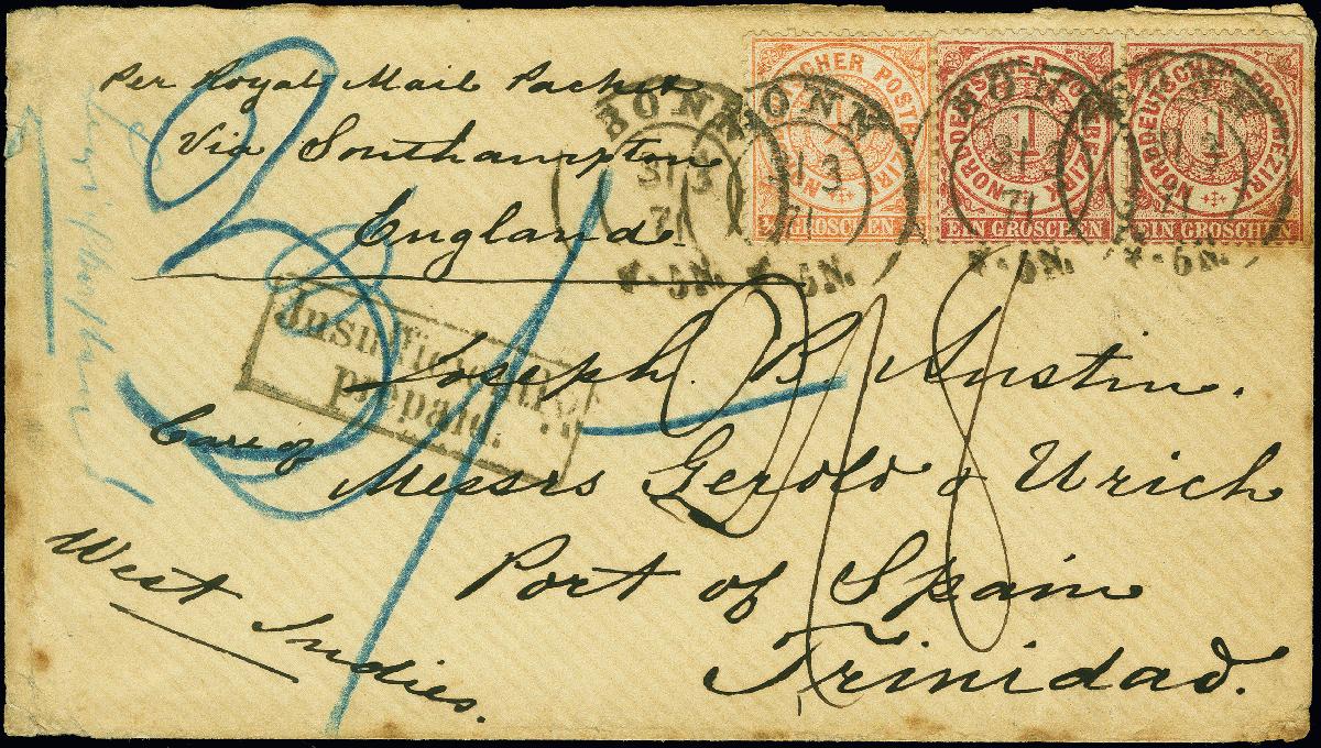 | Zusatzinformationen und Suchstichworte: | 380. Auktion Heinrich Köhler Auktionstermin 25.03.2023 Los 298 1869, ½ Groschen orange und 2 Einzelwerte 1 Groschen karmin, mit Doppelkreisstempel "BONN 31 3 71" auf Briefkuvert über England nach Port of Spain, Trinidad. Das geklebte Porto entsprach dem einfachen deutschen Portosatz nach Großbritannien, hier wurde der Brief als unfrankierter Brief der 2. britischen Gewichtsstufe behandelt und entsprechend mit 3/- taxiert, die vom Empfänger eingezogen wurden. Die rechts klebende 1 Groschen-Marke etwas fleckig und rechts etwas bestossen, sonst einwandfrei. Ein attraktiver und interessanter Brief mit sehr seltener Destination. Fotoattest Mehlmann BPP (2022) Ausruf 1.000,00 EUR Zuschlag 3.600,00 EUR (aus der Sammlung Erivan Haub) |