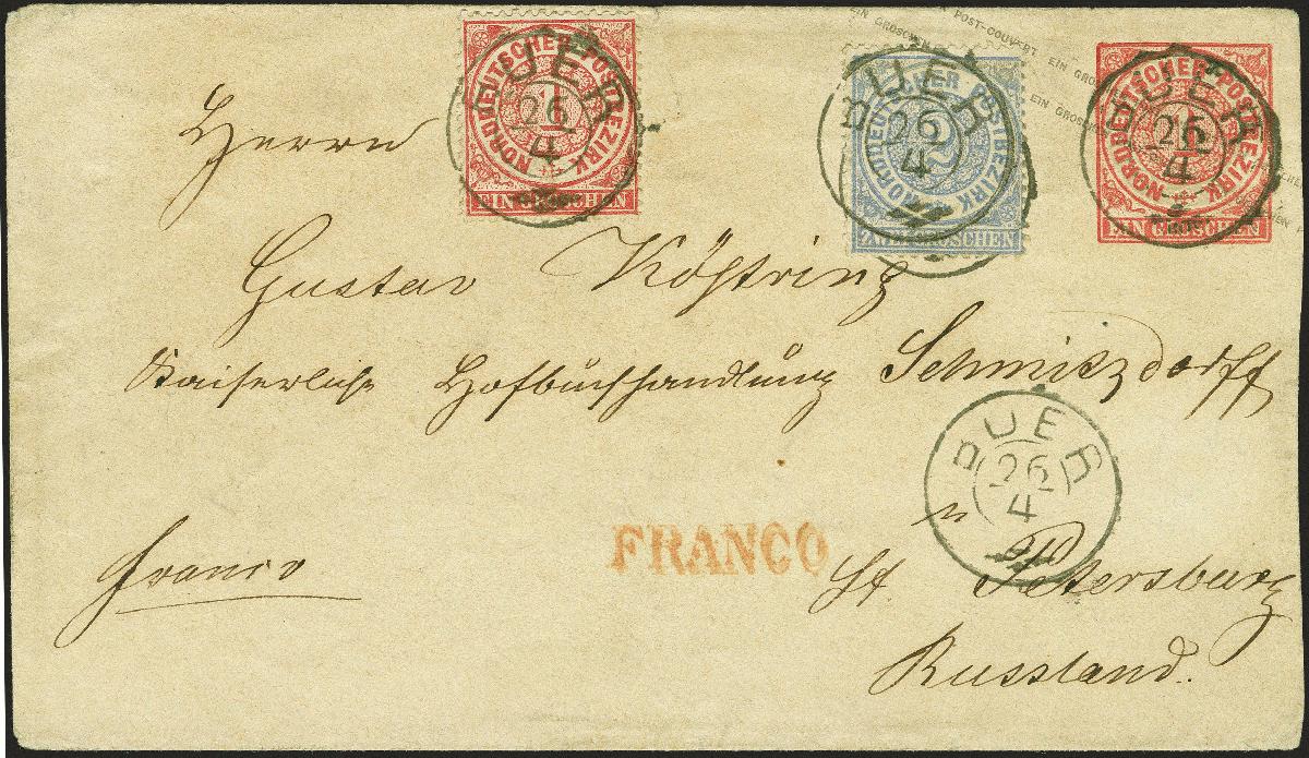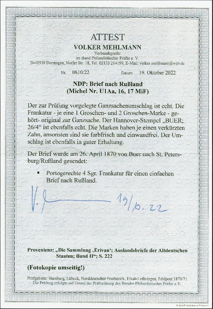 | Zusatzinformationen und Suchstichworte: | 380. Auktion Heinrich Köhler Auktionstermin 25.03.2023 Los 301 "BUER 26/4", Hannover-Doppelkreisstempel, klar auf- und nebengesetzt auf 1869, 1 Goschen karmin und 2 Groschen ultramarin, als Zufrankatur auf Ganzsachenumschlag 1 Groschen nach St. Petersburg, mit rückseitigem Ankunftsstempel. Eine attraktive Frankaturkombination in gute Erhaltung. Fotobattest Mehlmann BPP (2022) Ausruf 150,00 EUR Zuschlag 320,00 EUR (aus der Sammlung Erivan Haub) |