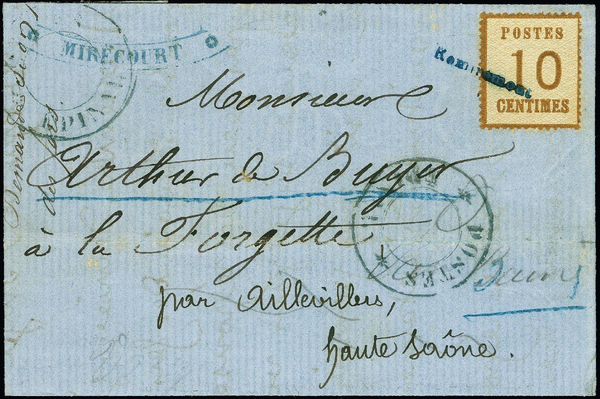 | Zusatzinformationen und Suchstichworte: | 380. Auktion Heinrich Köhler Auktionstermin 25.03.2023 Los 305 10 Centimes orangebraun, farbfrisch und gut gezähnt mit sauber aufgesetztem kleinen blauen Langstempel "Remiremont" auf nachgesandtem Brief aus Mirecourt mit nebengesetztem blauem Kreisstempel "POSTES EPINAL". Ein attraktiver und sehr seltener Brief. Fotoattest Scheller (2018) Ausruf 300,00 EUR Zuschlag 900,00 EUR (aus der Sammlung Erivan Haub) |