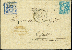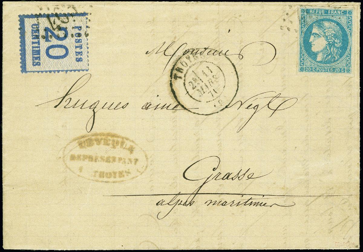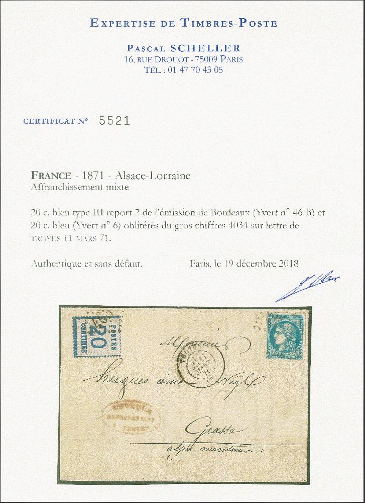 | Zusatzinformationen und Suchstichworte: | 380. Auktion Heinrich Köhler Auktionstermin 25.03.2023 Los 306 20 Centimes ultramarin in Mischfrankatur mit Bordeaux 20 Centimes, Type III, Report 2, beide entwertet durch GC "4034" auf Brief mit nebengesetztem Doppelkreisstempel "TROYES 11 MARS 71" nach Grasse. Eine seltene Kombination. Fotoattest Scheller (2018) Ausruf 300,00 EUR Zuschlag 360,00 EUR (aus der Sammlung Erivan Haub) |