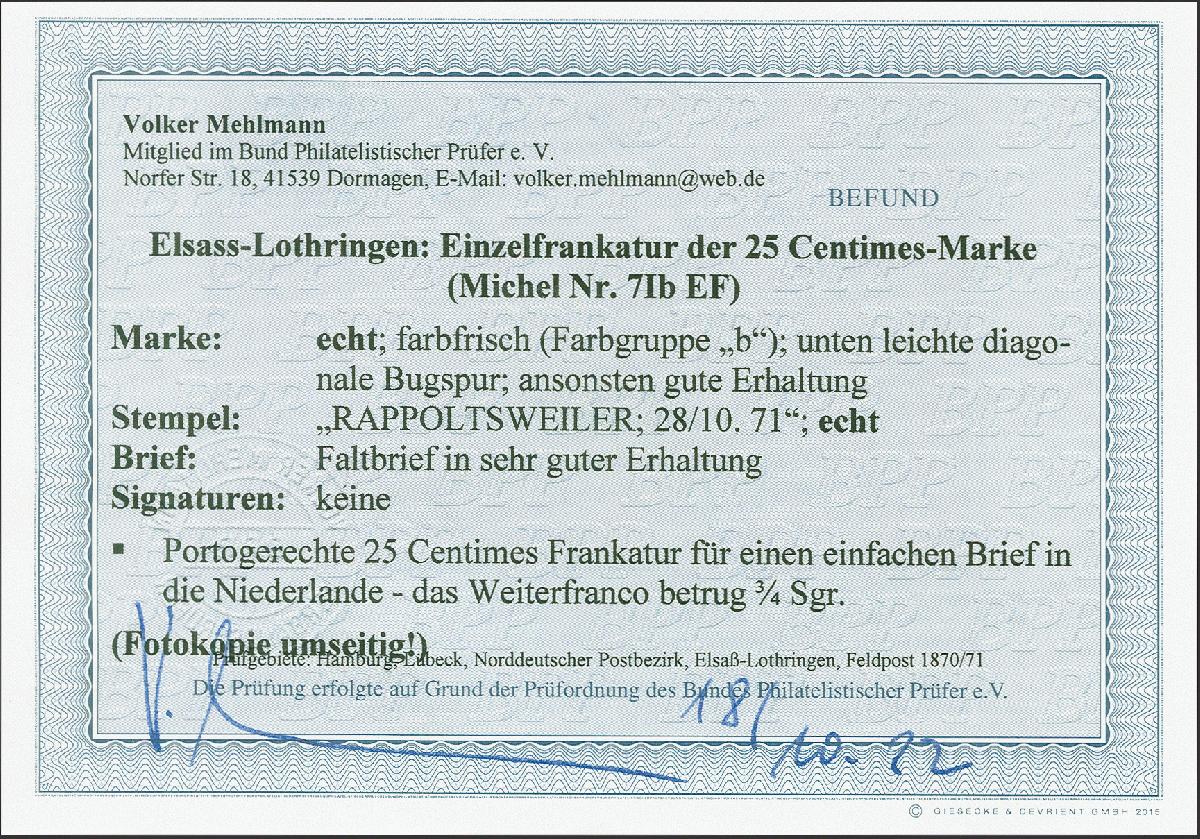 | Prüfgebiet: | Norddeutscher Postbezirk 1870 - 1871 Elsass-Lothringen |