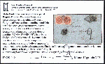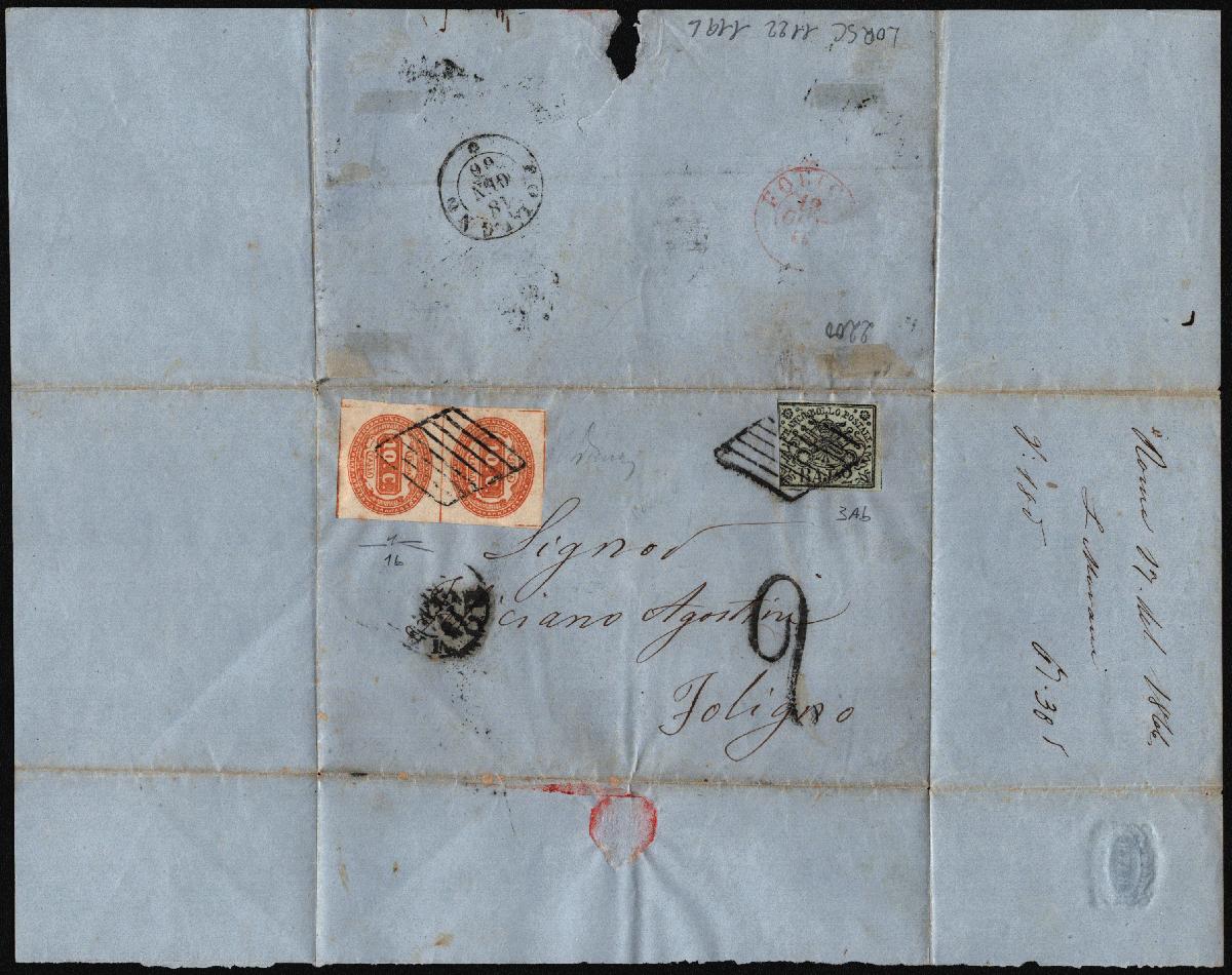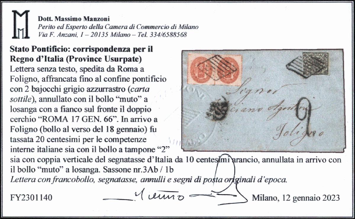 | Zusatzinformationen und Suchstichworte: | Versuch einer Übersetzung: Kirchenstaat: Korrespondenz für das Königreich Italien (usurpierte Provinzen) Brief ohne Text, abgeschickt von Rom nach Foligno, frankiert bis zur päpstlichen Grenze mit 2 blaugrauen Bajocchi (dünnes Papier), gestempelt mit dem rautenförmigen "stummen" Stempel flankiert vom Doppelkreis "ROMA 17 GEN. 66" auf die Front. Bei der Ankunft in Foligno (Stempel auf der Rückseite vom 18. Januar) wurden 20 Cent für inneritalienische Abgaben sowohl mit dem Block "2" als auch mit dem vertikalen Paar der orangefarbenen 10-Cent-Italien-Portogebühr versteuert, die bei der Ankunft mit dem "stummen" Stempel in Rautenform entwertet wurde. Sassone Nr.3Ab / 1b Brief mit Briefmarke, Nachporto, Entwertungen und originalen zeitgerechten Stempeln. |
