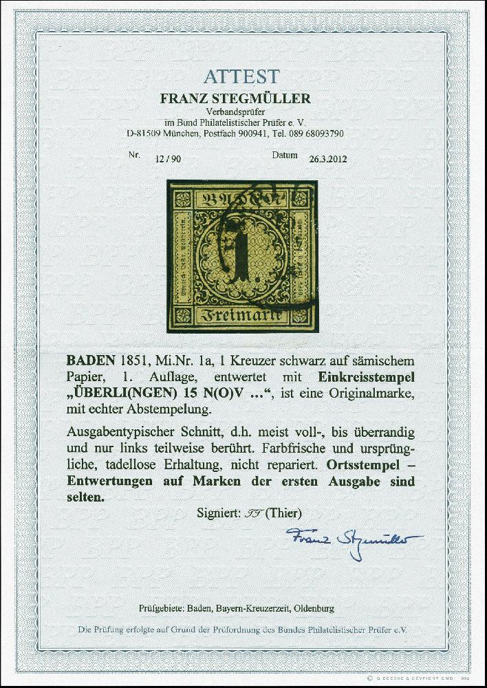 | Zusatzinformationen und Suchstichworte: | 380. Auktion Heinrich Köhler Auktionstermin 23.03.2023 Los 6001 1 Kreuzer auf sämisch, links leicht berührt, sonst voll- bis breitrandig, sauber entwertet durch Einkreisstempel von Überlingen. Eine außerordentlich seltene Ortsstempel-Entwertung auf der 1.Auflage. Fotoattest Stegmüller BPP (2012) Ausruf 400,00 EUR |