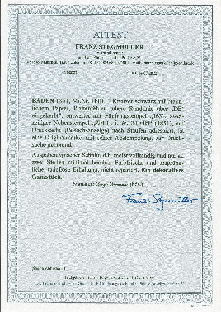 | Zusatzinformationen und Suchstichworte: | 380. Auktion Heinrich Köhler Auktionstermin 23.03.2023 Los 6002 1 Kreuzer auf bräunlich mit Plattenfehler "obere Randlinie über DE eingekerbt", an zwei Stellen minimal berührt, sonst vollrandig, mit Nr. "163" und sauber nebengesetztem Langstempel "ZELL i. W. 24 Okt" auf vollständiger Drucksache nach Staufen. Schöne und einwandfreie, ursprüngliche Erhaltung. Fotoattest Stegmüller BPP (2022) Ausruf 150,00 EUR |