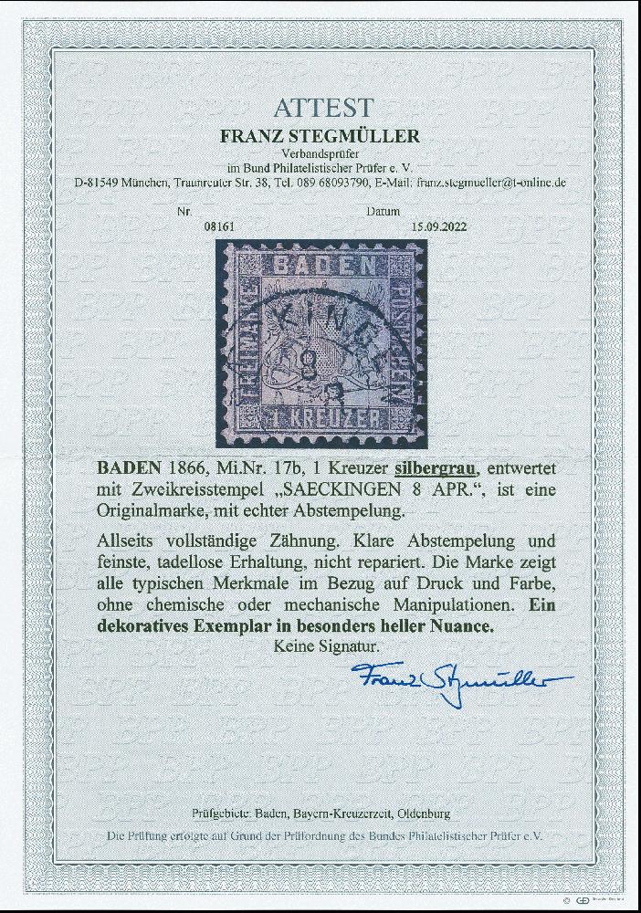 | Zusatzinformationen und Suchstichworte: | 380. Auktion Heinrich Köhler Auktionstermin 23.03.2023 Los 6006 1 Kreuzer silbergrau, farbfrisch und einwandfrei gezähnt, sauber entwertet durch Doppelkreisstempel "SAECKINGEN 8 APR. ". Schöne und tadellose Erhaltung. Fotoatteste Brettl BPP (1995) und Stegmüller BPP (2022) Ausruf 800,00 EUR |