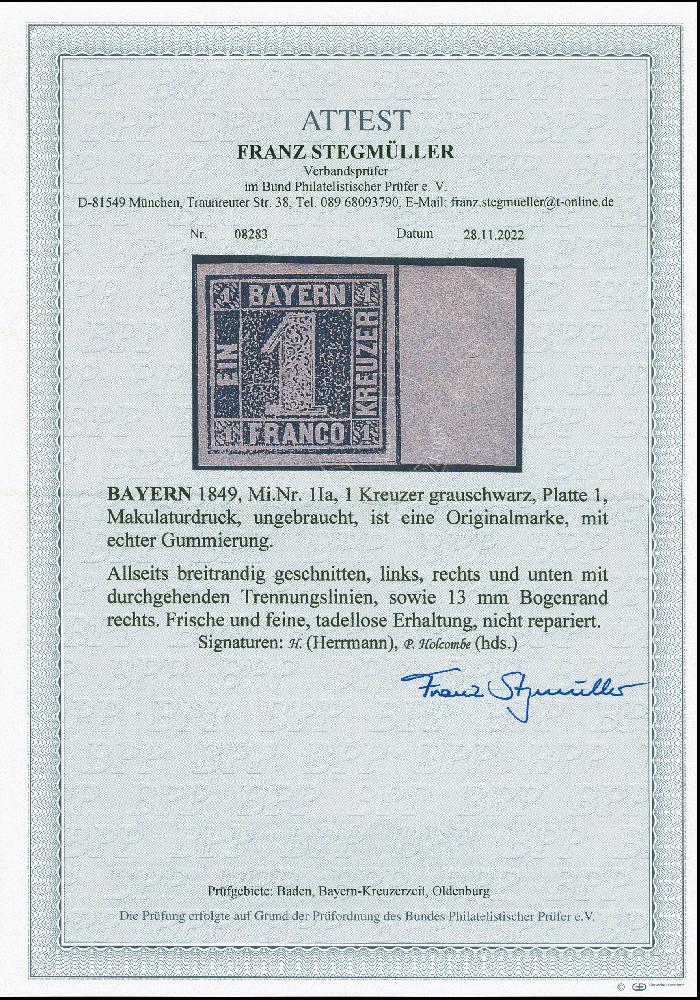 | Zusatzinformationen und Suchstichworte: | 380. Auktion Heinrich Köhler Auktionstermin 23.03.2023 Los 6011 1 Kreuzer grauschwarz, Platte 1, Makulaturdruck, farbfrisch und allseits breitrandig, rechts mit ca. 13 mm Bogenrand, ungebraucht mit Originalgummi, tadellos. Signiert Hermann und Holcombe, Fotoattest Stegmüller BPP (2022) Ausruf 300,00 EUR |