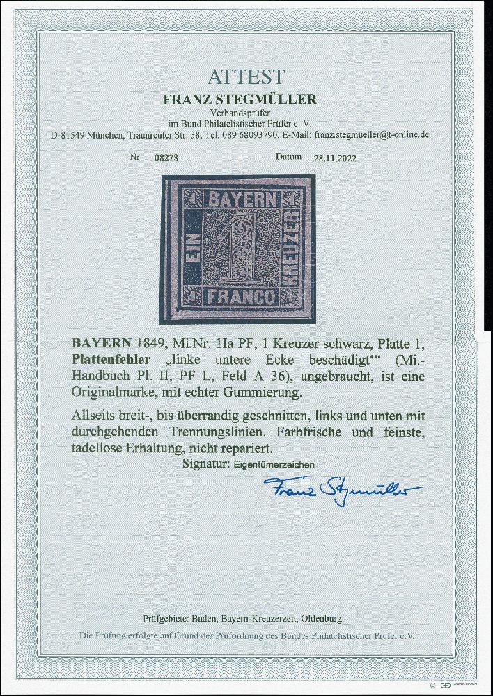 | Zusatzinformationen und Suchstichworte: | 380. Auktion Heinrich Köhler Auktionstermin 23.03.2023 Los 6012 1 Kreuzer grauschwarz, Platte 1, mit Plattenfehler 'linke untere Ecke beschädigt' farbfrisch und allseits breitrandig, zweiseitig mit durchgehenden Zwischenlinien, ungebraucht mit Originalgummi, tadellos. Private Signaturen und Fotoattest Stegmüller BPP (2022) Ausruf 500,00 EUR |