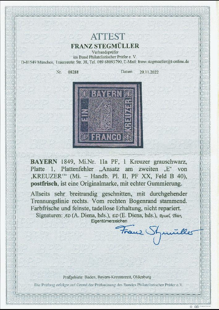| Zusatzinformationen und Suchstichworte: | 380. Auktion Heinrich Köhler Auktionstermin 23.03.2023 Los 6013 1 Kreuzer grauschwarz, Platte 1, mit Plattenfehler 'Ansatz am 2. E von KREUZER' farbfrisch und allseits breitrandig, rechts mit durchgehender Zwischenlinie, ungebraucht mit Originalgummi, tadellos. Mehrfach signiert und Fotoattest Stegmüller BPP (2022) Ausruf 500,00 EUR |
