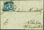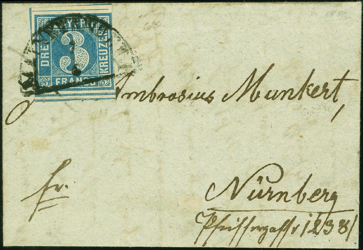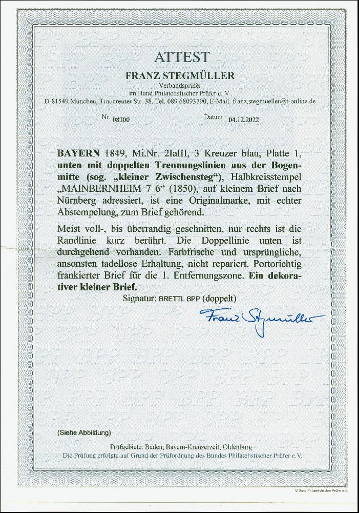 | Zusatzinformationen und Suchstichworte: | 380. Auktion Heinrich Köhler Auktionstermin 23.03.2023 Los 6033 3 Kreuzer blau, farbfrisch, rechts in der Randlinie kurz berührt, sonst voll- bis überrandig, unten mit fast vollständiger doppelter Trennungslinie (sogenannte 'Kleine Brücke'), mit sauber aufgesetztem Halbkreisstempel "MAINBERNHEIM 7 6" (1850) auf vollständigem kleinen Faltbrief nach Nürnberg. Schöne und sonst einwandfreie Erhaltung. Eine attraktive und seltene Frankatur. Signiert Brettl BPP und Fotoattest Stegmüller BPP (2022) Ausruf 400,00 EUR |