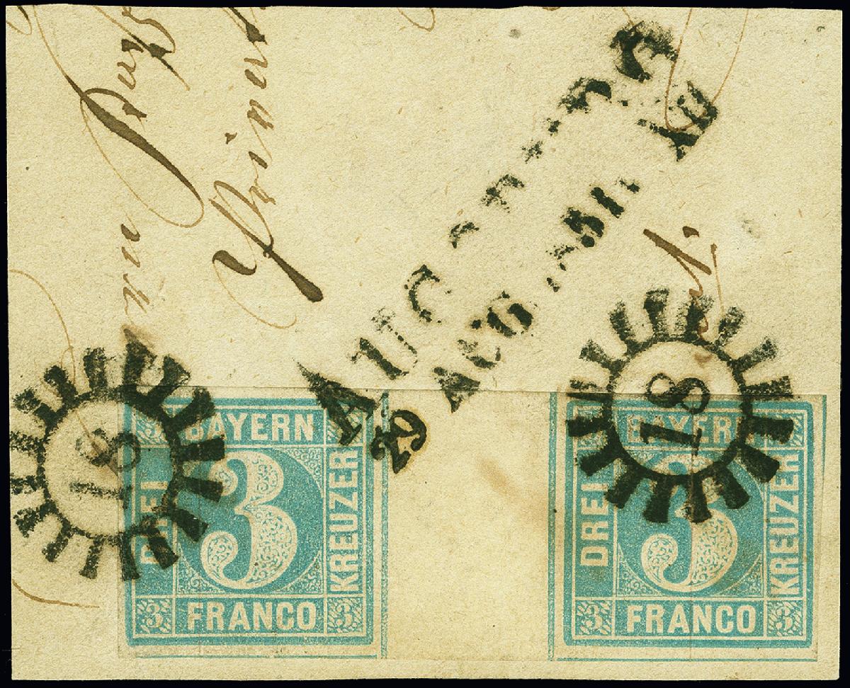 | Zusatzinformationen und Suchstichworte: | 380. Auktion Heinrich Köhler Auktionstermin 23.03.2023 Los 6041 3 Kreuzer blau, Platte 2, waagerechtes Zwischenstegpaar (sogenannte "Brücke") in typischer, frischer Farbe, links oben ist der Rand ergänzt, sonst allseits voll- bis breitrandig, mit Duplex-Entwertung durch gMR "18" und Langstempel "AUGSBURG 29 AUG 1851" auf Briefstück. Die Mühlradstempel aus optischen Gründen teilweise übermalt, sonst einwandfrei. Es sind nur ganz wenige Brückenpaare der Platte 2 registriert. Eine attraktive Bayern-Seltenheit. Signiert Hartmann und Fotoatteste Brettl BPP (1986) und Stegmüller BPP (2022) Ausruf 1.500,00 EUR |