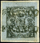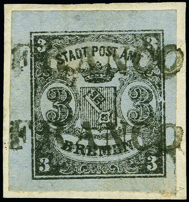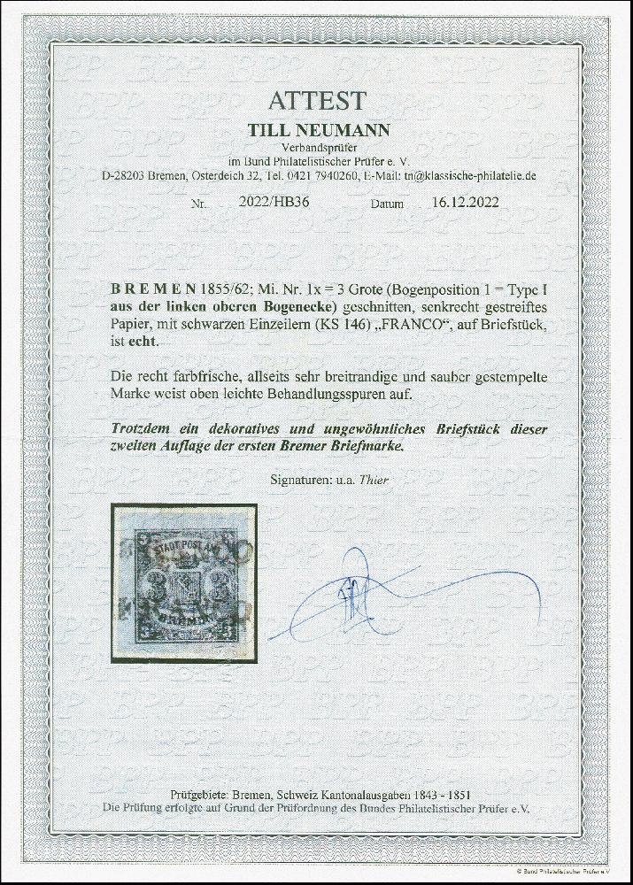 | Zusatzinformationen und Suchstichworte: | 380. Auktion Heinrich Köhler Auktionstermin 24.03.2023 Los 8002 3 Grote auf blaugrau, senkrecht gestreiftes Papier, farbfrisch und allseits ungewöhnlich breitrandig, mit zweimal sauber aufgesetztem Langstempel "FRANCO" auf kleinem Briefstück. Am Oberrand leichte Behandlungsspuren, sonst tadellos. Ein sehr attraktives Stück. Fotoattest Neumann BPP (2022) Ausruf 200,00 EUR |