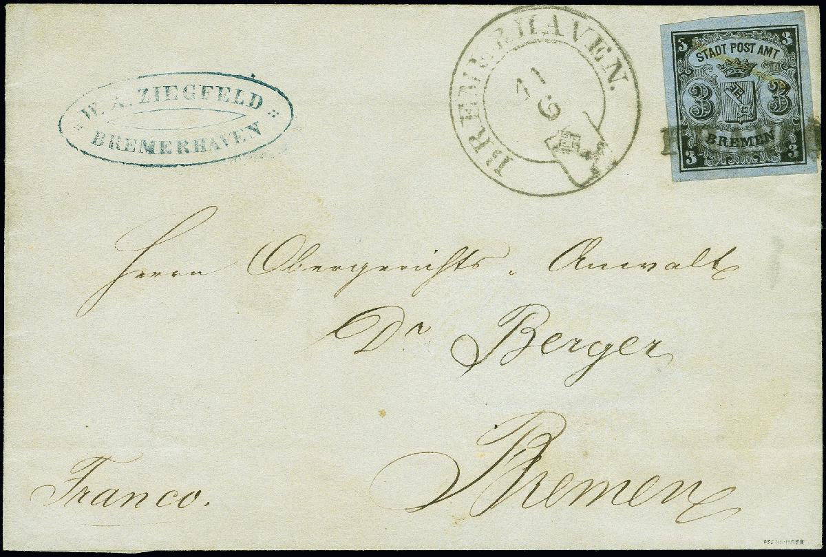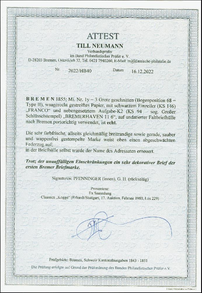 | Zusatzinformationen und Suchstichworte: | 380. Auktion Heinrich Köhler Auktionstermin 24.03.2023 Los 8008 3 Grote auf blaugrau, waagerecht gestreiftes Papier, farbfrisch und allseits breitrandig, mit sauber aufgesetztem Langstempel "FRANCO" und klar nebengesetztem Schlüsselstempel "BREMERHAVEN 11 6" auf Briefhülle nach Bremen. Ein zusätzlicher Federzug auf der Marke (anstelle eines 2. Stempelabschlages) wurde abgeschwächt, sonst sehr schöne und tadellose Erhaltung. Wir haben nur 2 weitere Briefe der Nr. 1 registriert, bei denen die Marke mit nur einem Abschlag des 'Franco'-Stempels entwertet wurde, beide ebenfalls mit Juni-Daten. Ein sehr attraktiver und seltener Brief. Signiert Pfenninger, Fotoattest Neumann BPP (2022) Ausruf 1.000,00 EUR |