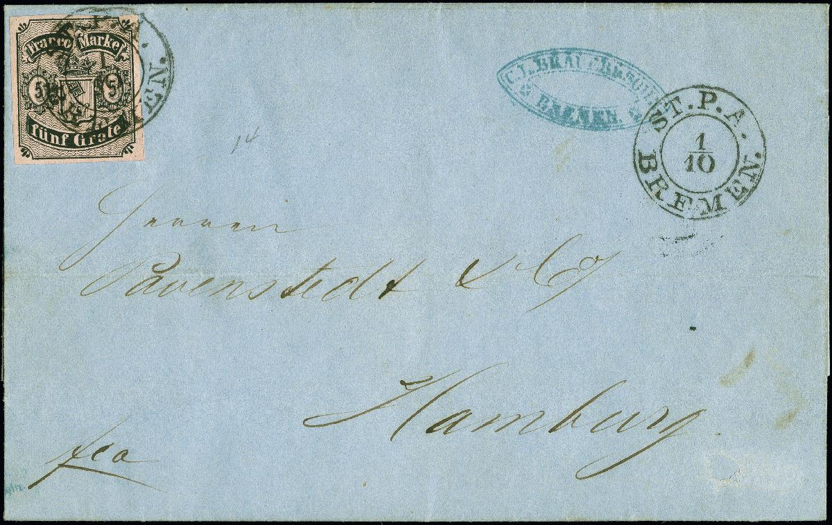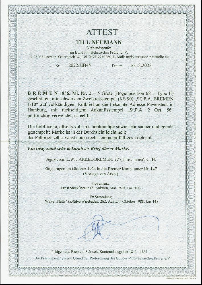 | Zusatzinformationen und Suchstichworte: | 380. Auktion Heinrich Köhler Auktionstermin 24.03.2023 Los 8011 1856, 2 Grote auf hellkarmingrau, farbfrisch und voll- bis breitrandig, mit sauber auf- und nebengesetztem kleinen Doppelkreisstempel "ST. P. A. BREMEN 1/10" (1856) auf komplettem Faltbrief nach Hamburg mit Ankunftsstempel. Die Marke erscheint in der Durchsicht leicht hell, der Brief unten rechts unauffälliges Loch, sonst einwandfrei und sehr attraktiv. Fotoattest Neumann BPP (2022) Ausruf 1.000,00 EUR |