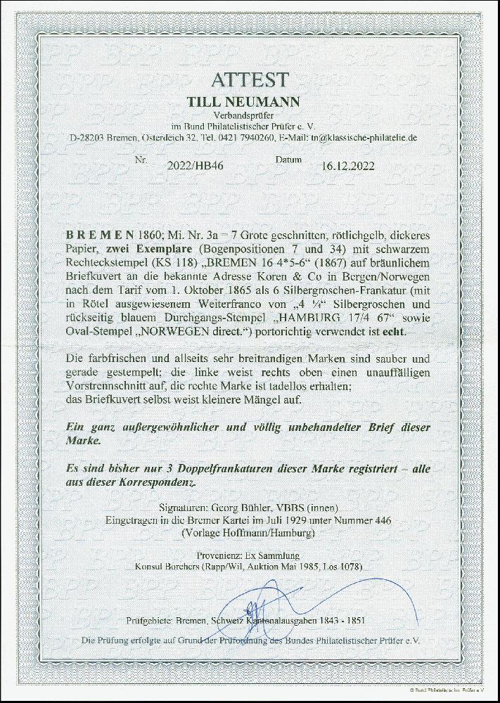 | Zusatzinformationen und Suchstichworte: | 380. Auktion Heinrich Köhler Auktionstermin 24.03.2023 Los 8013 7 Grote auf rötlichgelb, 2 Einzelwerte, beide farbfrisch und allseits breitrandig, mit sauber aufgesetztem Rahmenstempel "BREMEN 16 4" auf Briefkuvert nach Bergen in Norwegen mit rückseitigem Durchgangsstempel von Hamburg sowie Ovalstempel "NORWEGEN direct". Die linke Marke oben rechts kleiner Vortrennschnitt, das Kuvert übliche Beförderungspuren, sonst tadellos. Es sind nur 3 Doppelfrankaturen dieser Marke registriert, von denen die hier angebotene u.E. die attraktivste und qualitativ hochwertigste ist. Signiert Bühler und Fotoattest Neumann BPP (2022) Ausruf 8.000,00 EUR |