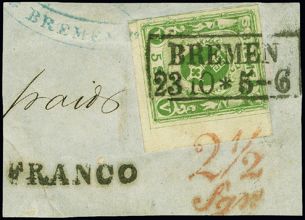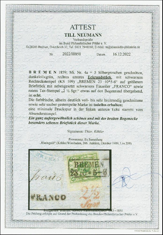 | Zusatzinformationen und Suchstichworte: | 380. Auktion Heinrich Köhler Auktionstermin 24.03.2023 Los 8014 5 Silbergroschen dunkelolivgrün, farbfrisch und voll- bis breitrandige rechte untere Bogenecke mit ca. 2/4 mm Bogenrändern, mit klar aufgesetztem Rahmenstempel "BREMEN 23 10" und teils auf den Rand übergehendem Verrechnungsstempel "2½ Sgr" auf größerem Briefstück. Ein sehr attraktives Ausnahmestück in tadelloser Erhaltung. Signiert Thier und Köhler, Fotoattest Neumann BPP (2022) Provenienz: 'Rheingold' (266. Heinrich Köhler-Auktion, 1989) Ausruf 400,00 EUR |