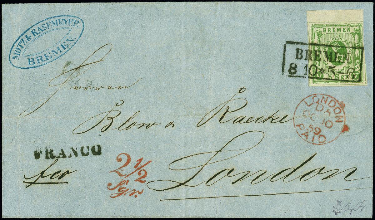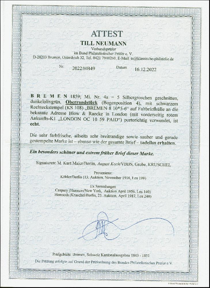 | Zusatzinformationen und Suchstichworte: | 380. Auktion Heinrich Köhler Auktionstermin 24.03.2023 Los 8015 5 Silbergroschen dunkelolivgrün, farbfrisch und allseits sehr breitrandiges Oberrandstück mit ca. 4 mm Bogenrand, mit klar aufgesetztem Rahmenstempel "BREMEN 8 10" (1859) auf Briefhülle nach London, mit nebengesetztem roten Eingangsstempel sowie rotem Verrechnungsstempel "2½ Sgr.". Ein besonders schöner und früher Brief in tadelloser Erhaltung. Signiert Kurt Maier, August Koch, Grobe und Kruschel, Fotoattest Neumann BPP (2022) Ausruf 2.000,00 EUR |