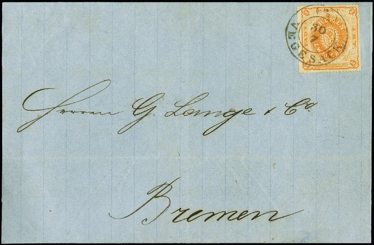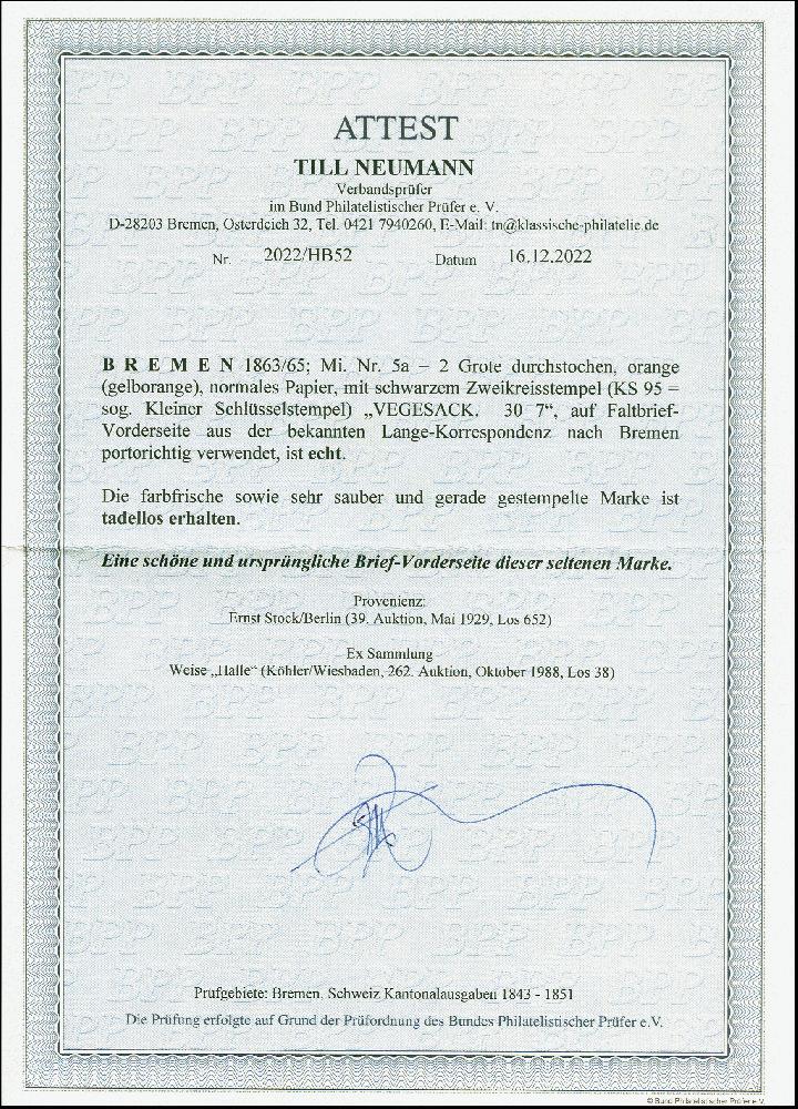 | Zusatzinformationen und Suchstichworte: | 380. Auktion Heinrich Köhler Auktionstermin 24.03.2023 Los 8018 1863, 2 Grote orange, normales Papier, farbfrisch und einwandfrei durchstochen, mit klar aufgesetztem kleinen Schlüsselstempel "VEGESACK 30 7" auf Briefvorderseite der bekannten 'Lange'-Korrespondenz nach Bremen. Ein sehr schönes Stück in frischer und tadelloser Erhaltung. Ganzstücke der Nr. 5 in dieser schönen Erhaltung sind kaum zu finden. Fotoattest Neumann BPP (2022) Ausruf 1.000,00 EUR |
