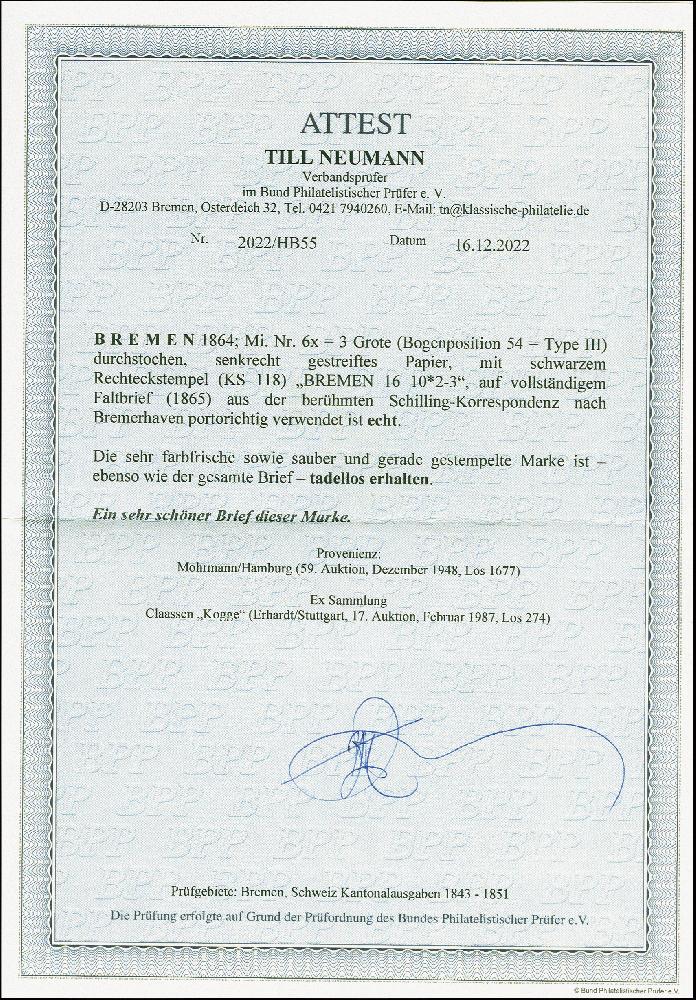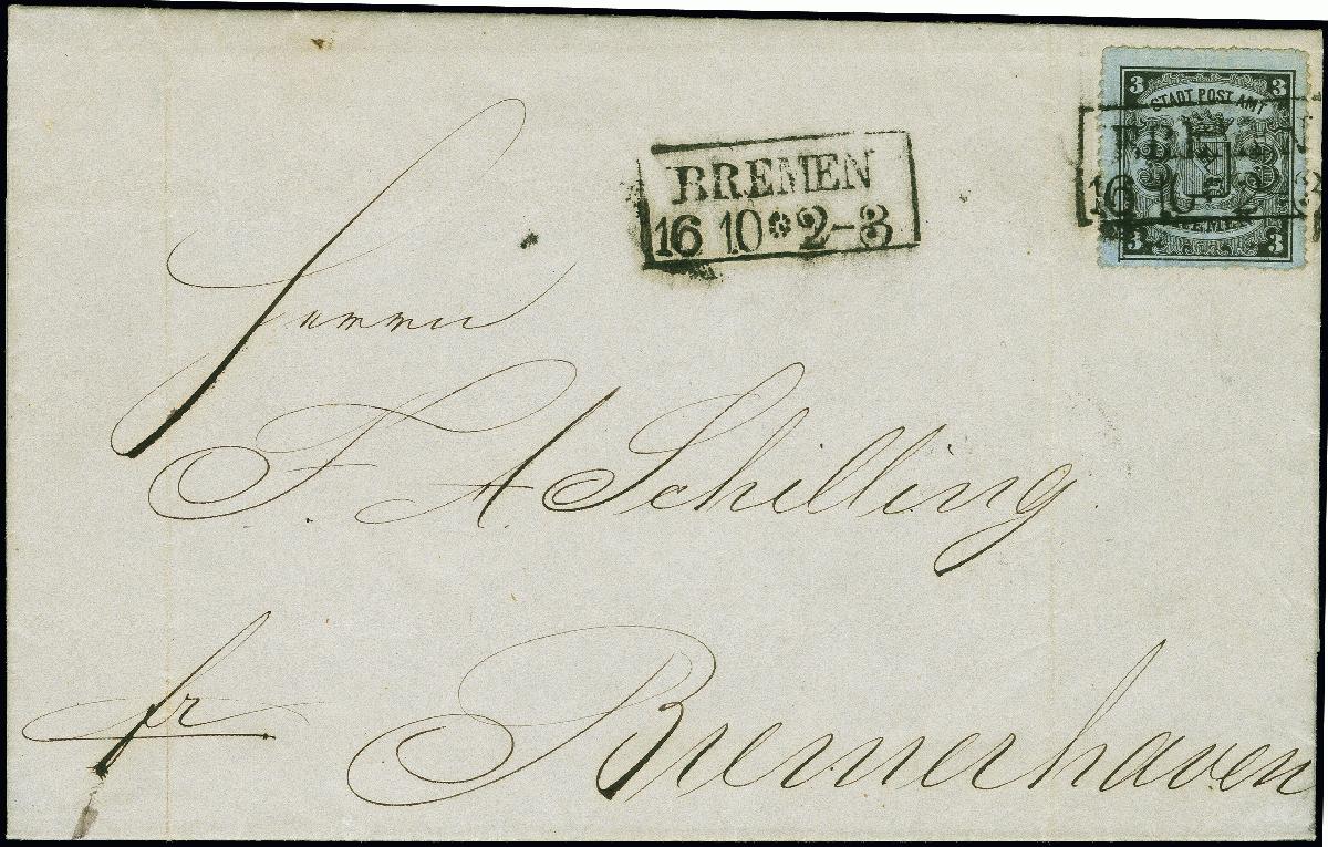 | Zusatzinformationen und Suchstichworte: | 380. Auktion Heinrich Köhler Auktionstermin 24.03.2023 Los 8020 1864, 3 Grote schwarz auf blaugrau, durchstochen, senkrecht gestreiftes Papier, sehr schön farbfrisch, mit klar auf- und nebengesetztem Rahmenstempel "BREMEN 16 10" (1865) auf komplettem Faltbrief der bekannten 'Schilling'-Korrespondenz nach Bremerhaven. Frische und tadellose Erhaltung. In dieser Qualität ein Ausnahmestück. Fotoattest Neumann BPP (2022) Ausruf 1.000,00 EUR |