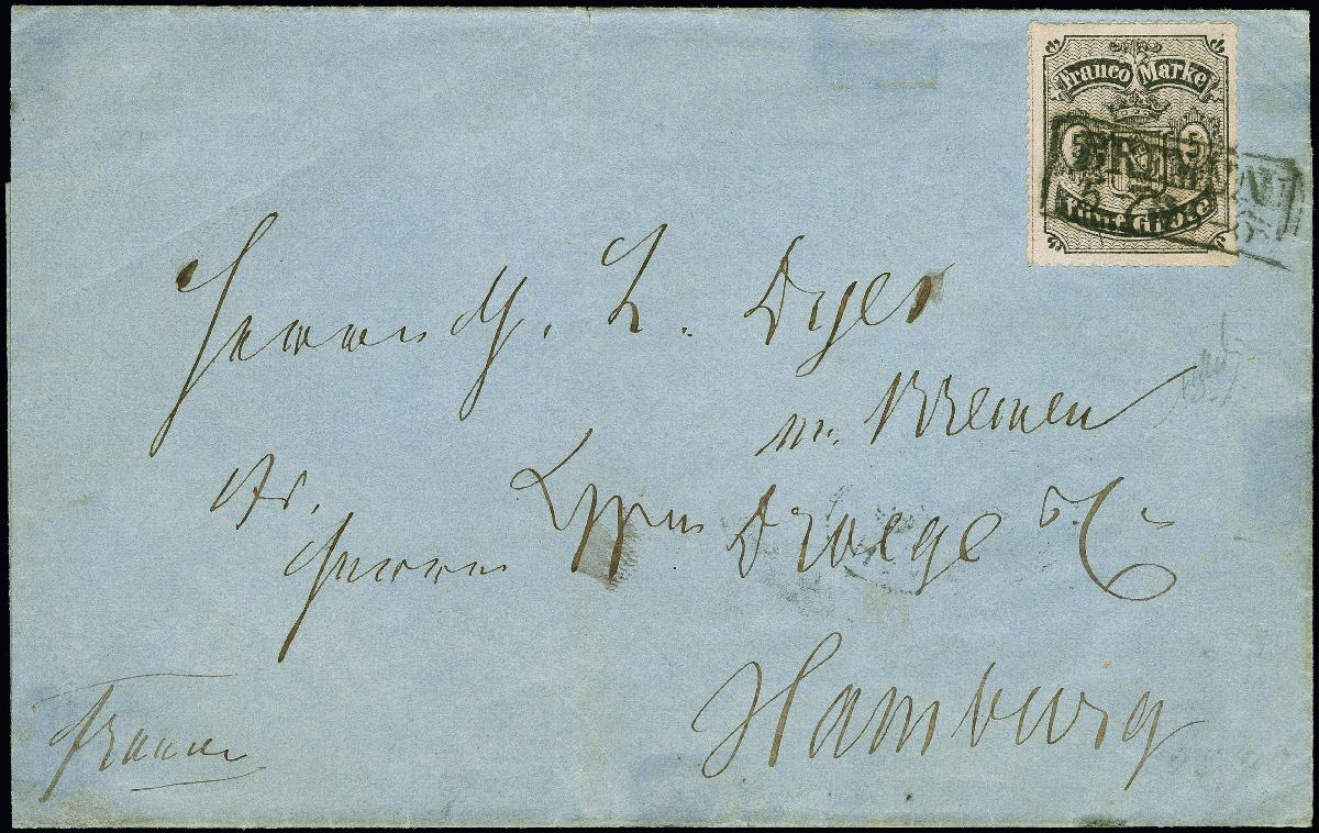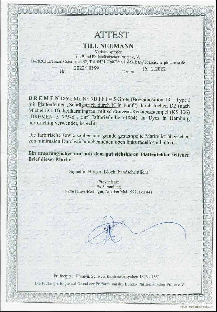 | Zusatzinformationen und Suchstichworte: | 380. Auktion Heinrich Köhler Auktionstermin 24.03.2023 Los 8023 1862, 5 Grote auf hellkarmingrau, mit dem nur einmal im Bogen vorkommenden Plattenfehler'Schrägstrich durch n von Fünf', sehr schön farbfrisch, mit sauber aufgesetztem Rahmenstempel "BREMEN 5 7" (1864) auf Briefhülle nach Hamburg. Bis auf minimale Durchstichunebenheiten oben links, tadellos (Hülle mit kleinen Falzflecken). Fotoattest Neumann BPP (2022) Ausruf 500,00 EUR |