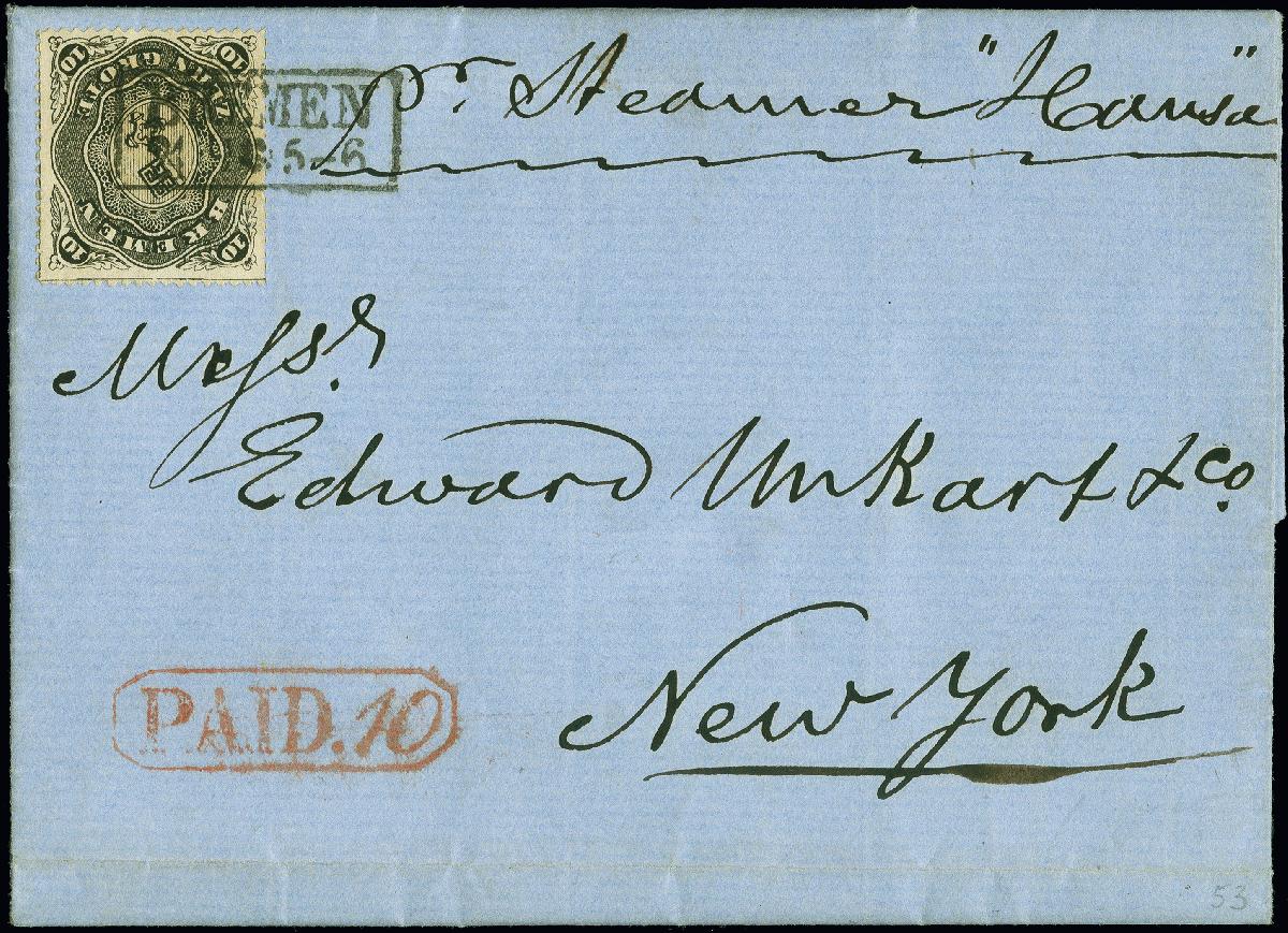 | Zusatzinformationen und Suchstichworte: | 380. Auktion Heinrich Köhler Auktionstermin 24.03.2023 Los 8026 1863, 10 Grote schwarz, durchstochen, sehr farbfrisch, mit klar und gerade aufgesetztem Rahmenstempel "BREMEN 24 9" (1864) auf Briefhülle der 'Unkart'-Korrespondenz nach New York. Besonders frische und tadellose Erhaltung; schöner nicht möglich. Ausruf 1.500,00 EUR |