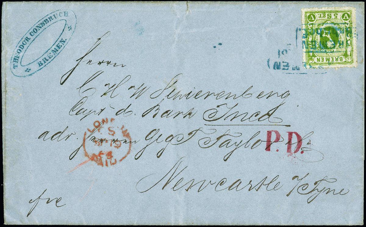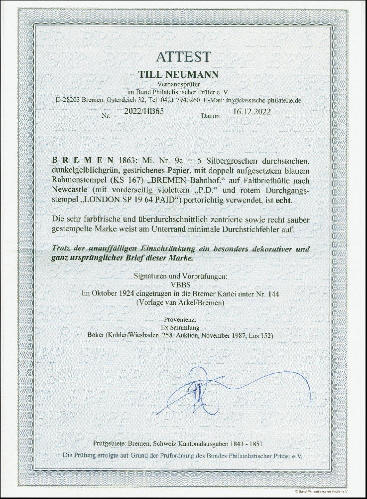 | Zusatzinformationen und Suchstichworte: | 380. Auktion Heinrich Köhler Auktionstermin 24.03.2023 Los 8028 5 Silbergroschen dunkelgelblichgrün auf gestrichenem Papier, farbfrisch und bis auf minimale Durchstichfehler am Unterrand einwandfrei, mit doppelt aufgesetztem blauem Rahmenstempel "BREMEN Bahnhof" auf Briefhülle 1864 nach London mit vorderseitigem roten Ankunftsstempel. Ein attraktiver Brief mit der seltenen Farbnuance, in ursprünglicher Erhaltung. Fotoattest Neumann BPP (2022) Ausruf 800,00 EUR |