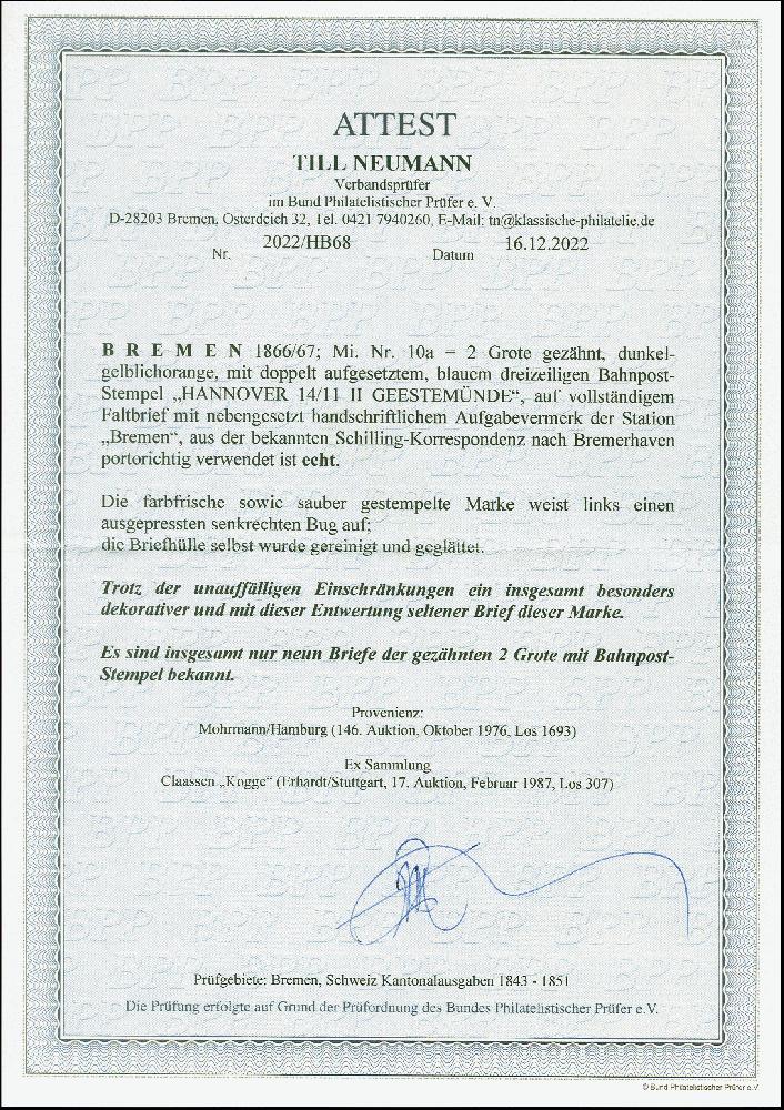 | Zusatzinformationen und Suchstichworte: | 380. Auktion Heinrich Köhler Auktionstermin 24.03.2023 Los 8031 2 Grote dunkelgelblichorange, farbfrisch und ausgabetypisch etwas unregelmäßig gezähnt, mit zweimal sauber aufgesetztem blauen Bahnpost-L3 "HANNOVER 14 / 11 II GEESTEMÜNDE", auf vollständigem Faltbrief mit handschriftlichem Aufgabevermerk "Bremen", nach Bremerhaven. Links in der Marke ausgepresster Bug, die Hülle etwas gereinigt und geglättet. Ein attraktiver und seltener Brief, es sind nur 8 weitere dieser Marke mit Bahnpost-Entwertung registriert. Fotoattest Neumann BPP (2022) Ausruf 500,00 EUR |