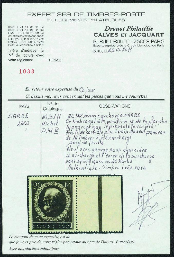 | Zusatzinformationen und Suchstichworte: | Gert Müller 117. Auktion 23. Februar 2023 DIE KÖNIGIN DER SAAR: 20 Mk. Bayern-Sarre mit Abart "FETTER KONTROLLSTRICH" herrlich farbfrisch, sehr gut gezähnt mit breitem rechtem Bogenrand, nahezu postfr. mit Originalgummierung. Die Gesamtauflage belief sich auf lediglich 16 Stück, wovon ein Exemplar seit dem II. Weltkrieg verschollen ist. Mit der Aufdruckabart handelt es sich um ein spektakuläres Unikat. Diese Briefmarke gelangte nicht zur Ausgabe, sondern wurde nur an hochrangige Personen verteilt. Es handelt sich hierbei um eine der spektakulärsten und größten Raritäten der Deutschland-Philatelie. Das hier angebotene Stück zeichnet sich durch seine hervorragende Qualität aus, ohne die sonst bei dieser Ausgabe üblichen Knitter. Eine Welt-Rarität und die Krönung jeder Saar-Sammlung! Fotoatteste Dr. Dub (1937), Pascal Scheller (2010), Calves/Jacquart (2011) und "DIE QUALITÄT IST EINWANDFREI" Braun BPP(2012) Zuschlag 108.000,00 EUR |