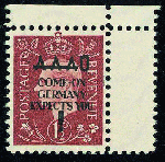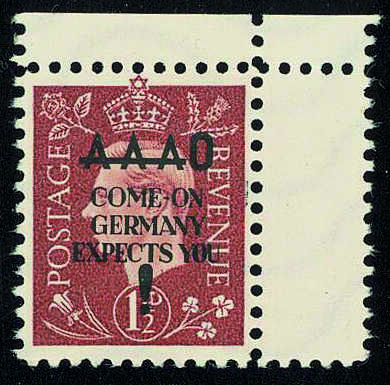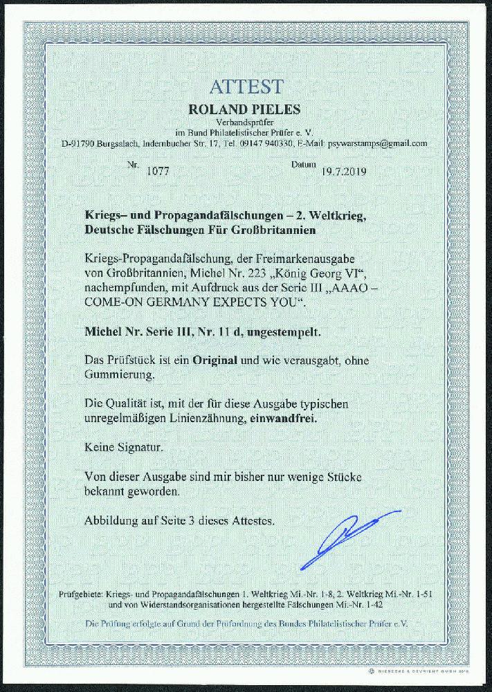 | Zusatzinformationen und Suchstichworte: | Gert Müller 117. Auktion 23. Februar 2023 Los 6134 Kriegs und Propagandafälschungen II. WK DIE KÖNIG GEORG VI.-TOPRARITÄT: Deutsche Fälschungen für Grossbritannien, 1 1/2 P. König Georg VI. mit schwarzem Aufdruck "AAAO-COME ON GERMANY EXPECTS YOU", farbfrisch und tadellos ungebraucht, wie verausgabt auf ungummiertem Papier, rechts mit Zwischenstegansatz. Es sind nur sechs Serien hiervon erhalten geblieben, sodass dieser Wert zu den größten Raritäten dieses Gebietes zählt. In dieser exzellenten Qualität handelt es sich wahrscheinlich um das schönste bekannte Exemplar! Fotoattest "EINWANDFREI" Pieles BPP Zuschlag 9.500,00 EUR |