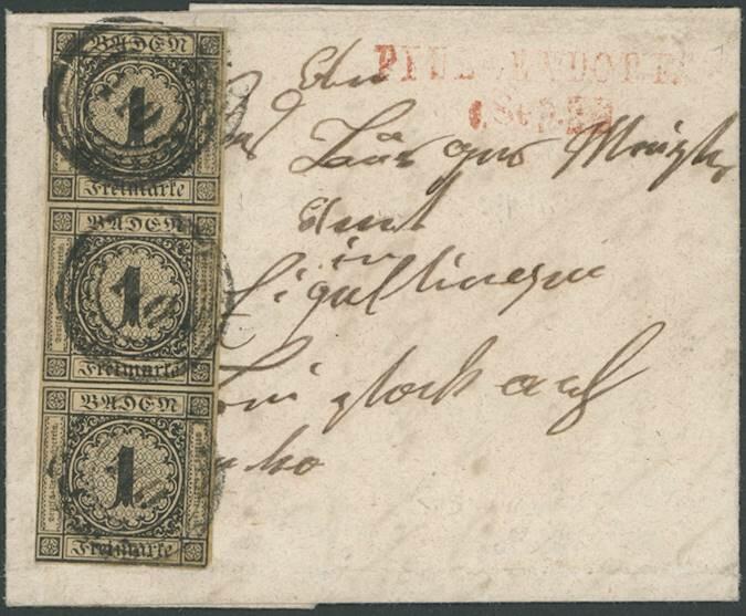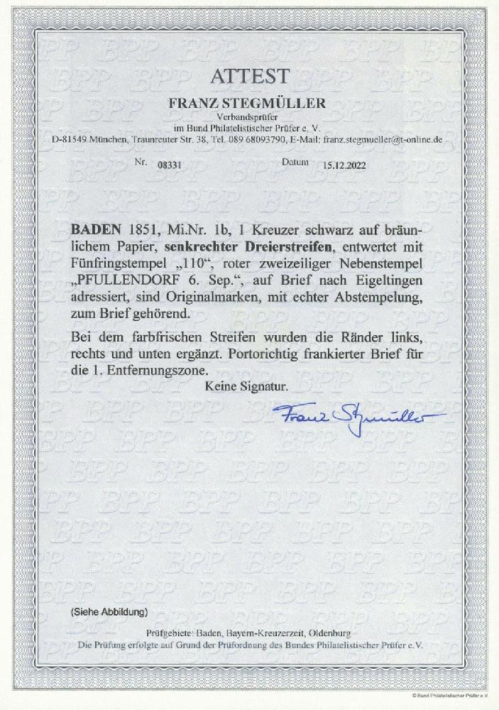 | Zusatzinformationen und Suchstichworte: | Ulrich Felzmann 177. Auktion 8. - 11. März 2023 Los 1363 Altdeutschland Baden 1 Kr auf bräunlich im senkrechten Dreierstreifen, dessen üblicher Schnitt an drei Seiten ergänzt wurde, dessen ungeachtet sehr attraktiv und tarifrichtig auf Brief nach Eigeltingen, sauber entwertet "110" mit beisitzendem rotem L2 PFULLENDORF 6. SEP., Fotoattest Stegmüller BPP Zuschlag 220,00 EUR |